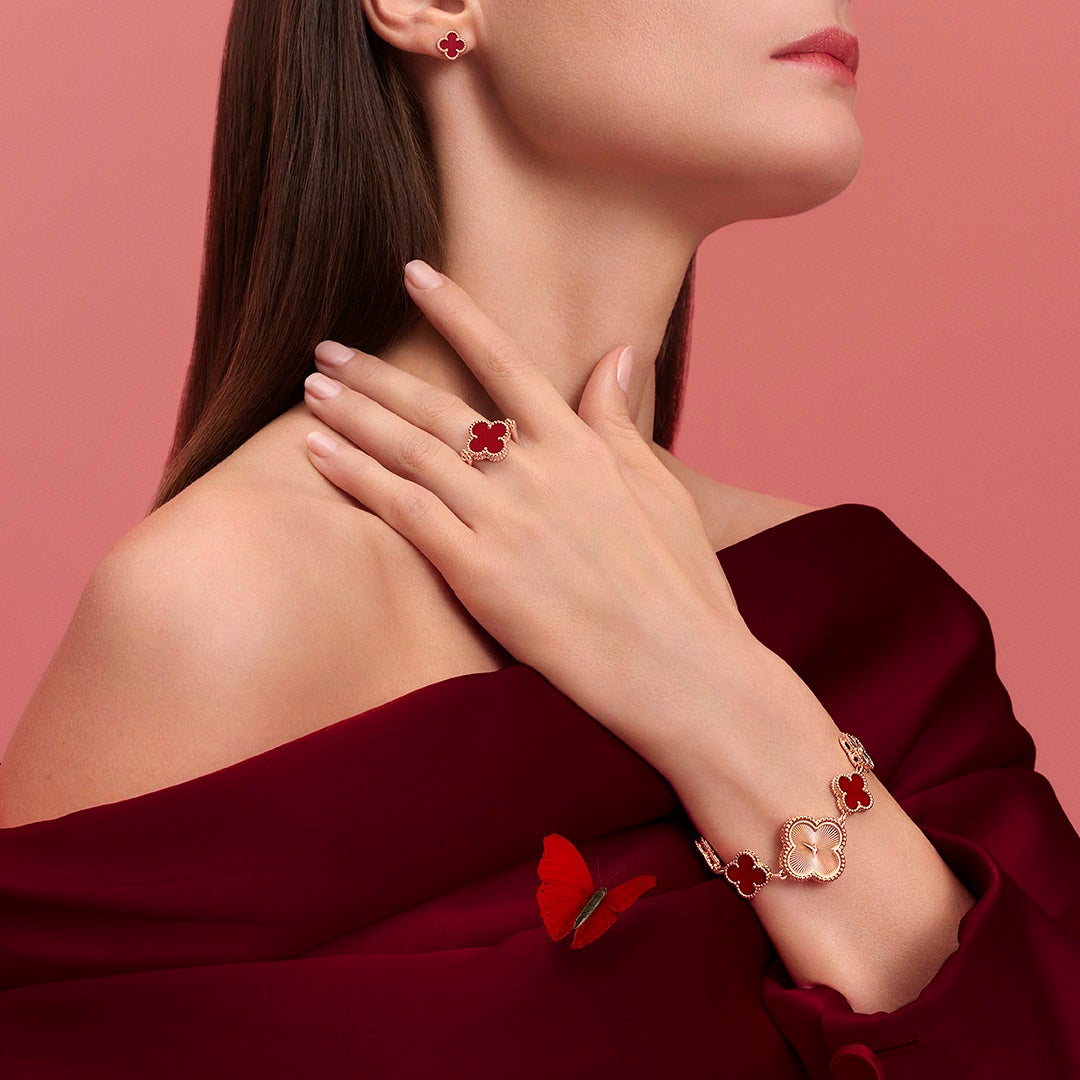 ギヨシェ彫刻を施したローズゴールドのまばゆい反射と、カーネリアンの鮮やかなニュアンスが融合し、優しいハーモニーを奏でるアルハンブラの新作4点が生まれました。その中には、このふたつの素材を気分に応じて表裏を返して身に着けられるリバーシブルリングも含まれ、目を楽しませてくれます。今回、アルハンブラ コレクションに初めて登場したこの新しいデザインには、多彩な装い方を追求するメゾンならではの伝統と特徴的な技巧が映し出されています。四つ葉のクローバーから着想を得て1968年に誕生したアルハンブラ モチーフは、ヴァン クリーフ&アーペルを象徴する美学をたたえ、こうして現在に至るまでジュエリーやウォッチの新作を通して変わることなく幸運を祝福しています。