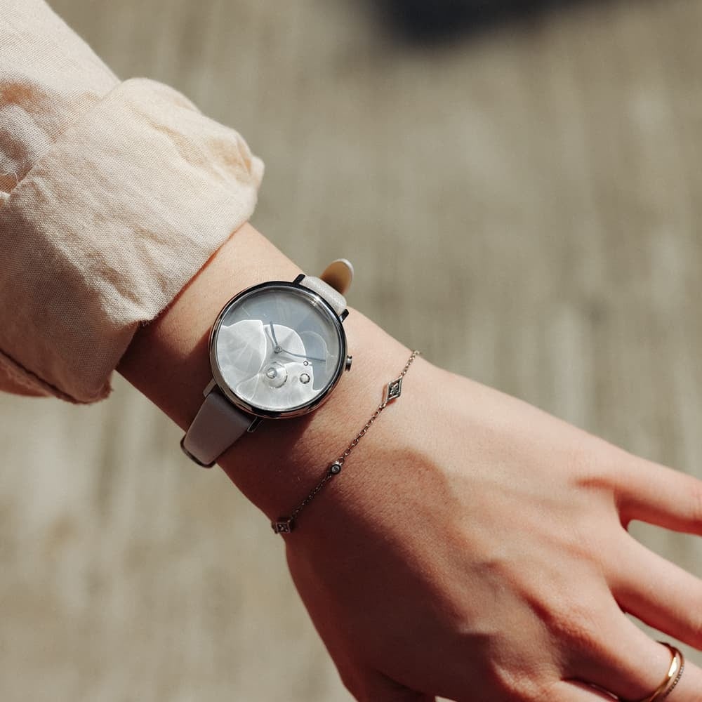 ICE BUBBLEは氷が持つ清涼感と自然光との融和をイメージしたシリーズで、あたかも本物の氷で作られたかのようなガラス面・気泡を再現、豊かな自然が創り出す芸術作品に落とし込みました。ICE BUBBLEで再現された氷の中にある気泡は特殊加工が施され、更にスモールセコンドとして時を刻むというユニークなアイディアを取り入れるだけでなく、数字や目盛りを削ぎ落したミニマルデザインでプロダクトの美しさを強調するだけでなく、光の屈折との調和がデザインとして溶け込むことで着ける時間帯や見る角度によって様々に表情が変化します。