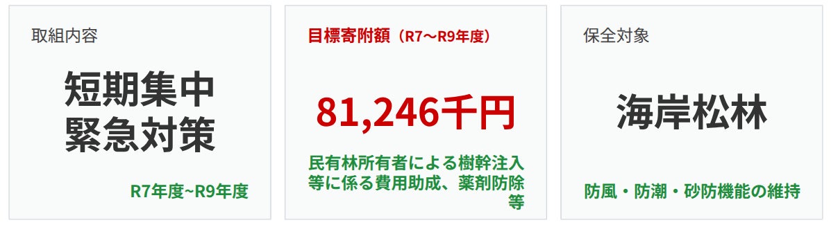 いただいた寄附金は、これらの防除対策にダイレクトに活用させていただきます。皆様のご支援が、宮崎の海岸松林を直接守る力となります。
