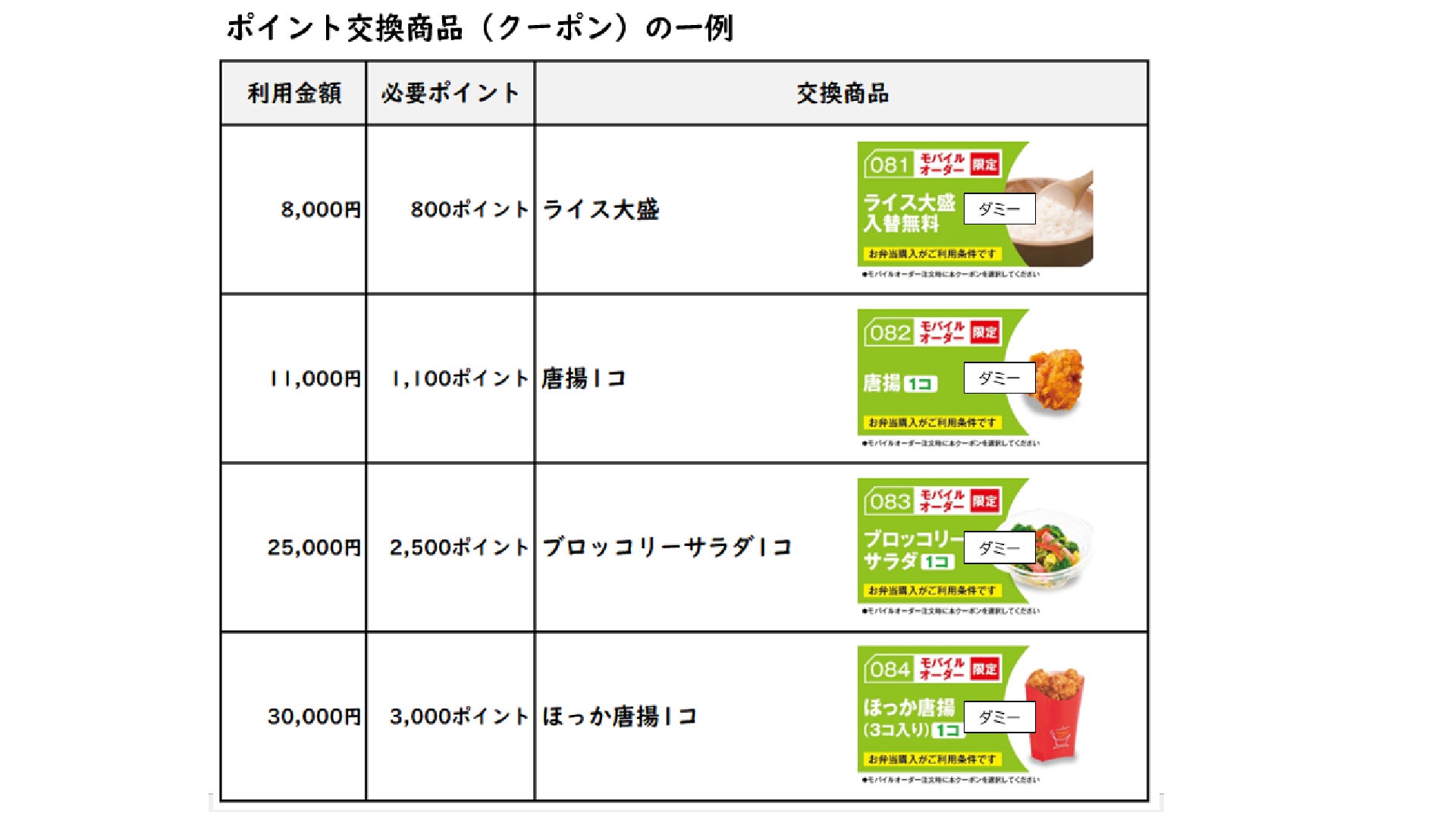 ポイントが貯まれば、「ライス大盛」や「唐揚」などといった人気商品のクーポンに「ほっかアプリ」内で交換が可能です。ポイントは付与日から1年間有効となり、未使用の場合、自動的に失効となります。ポイントはアプリ内でクーポンに交換し、対象店舗でモバイルオーダーにて特典を受ける形でご利用いただけます。ポイントの換金や第三者への譲渡はできません。