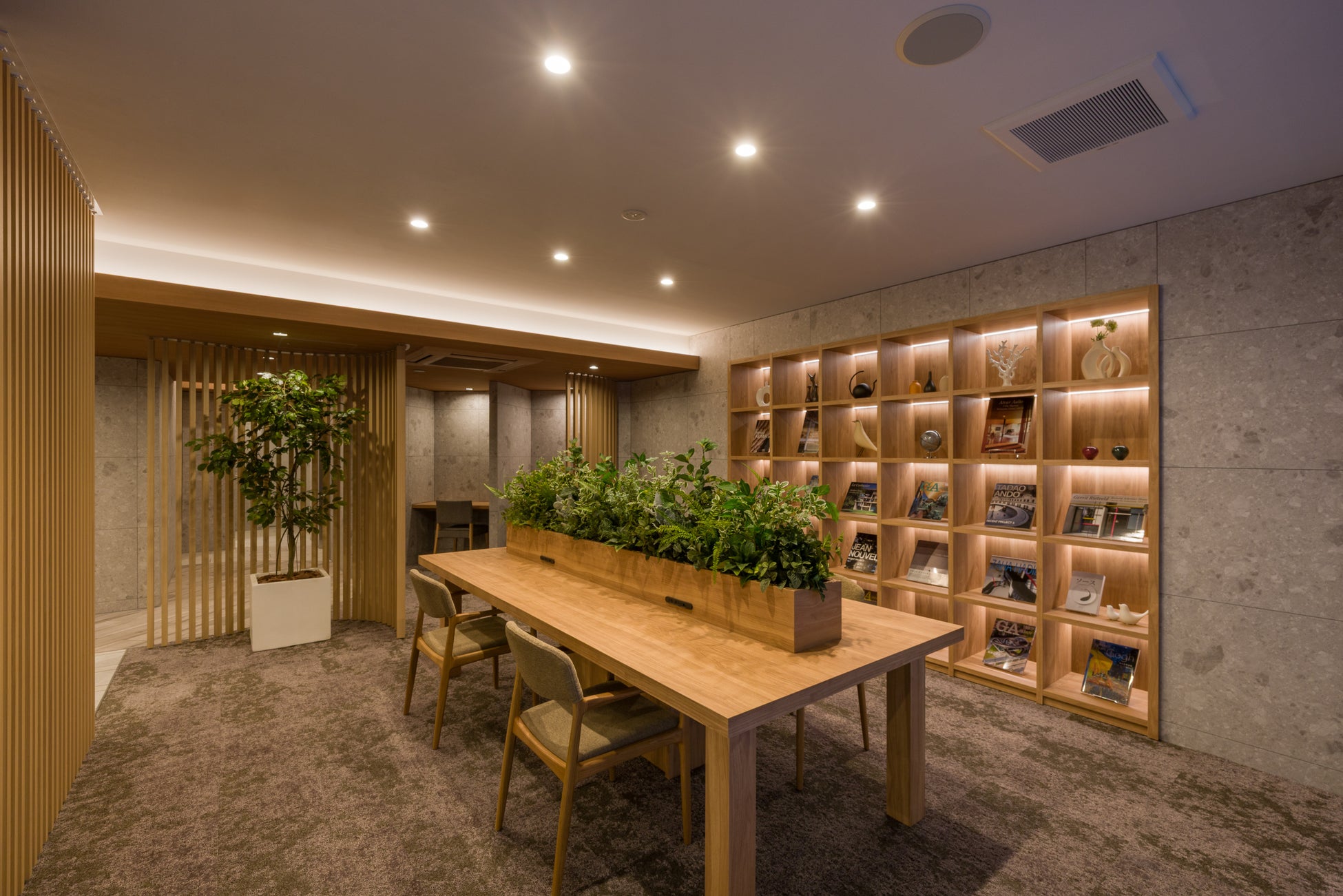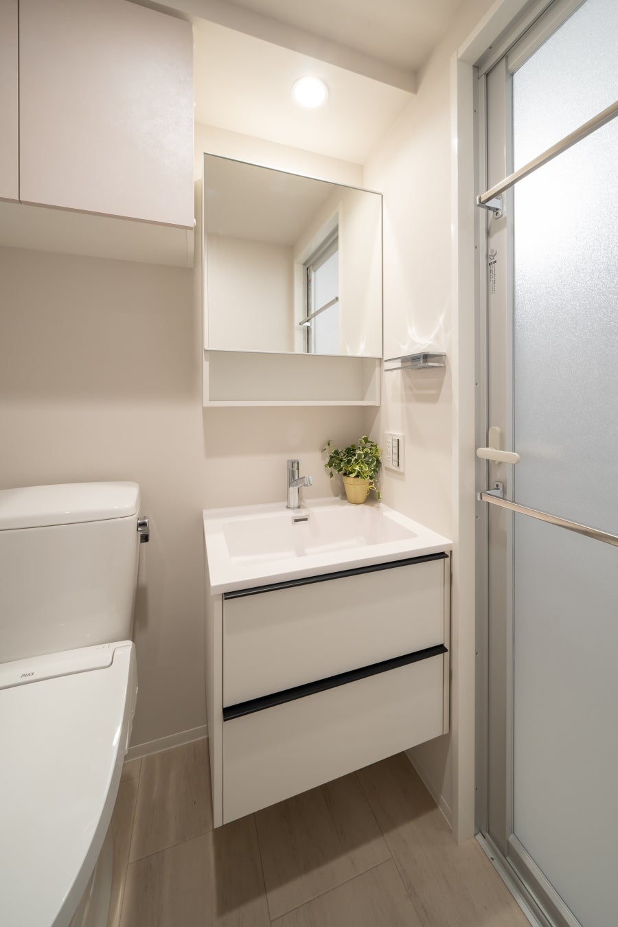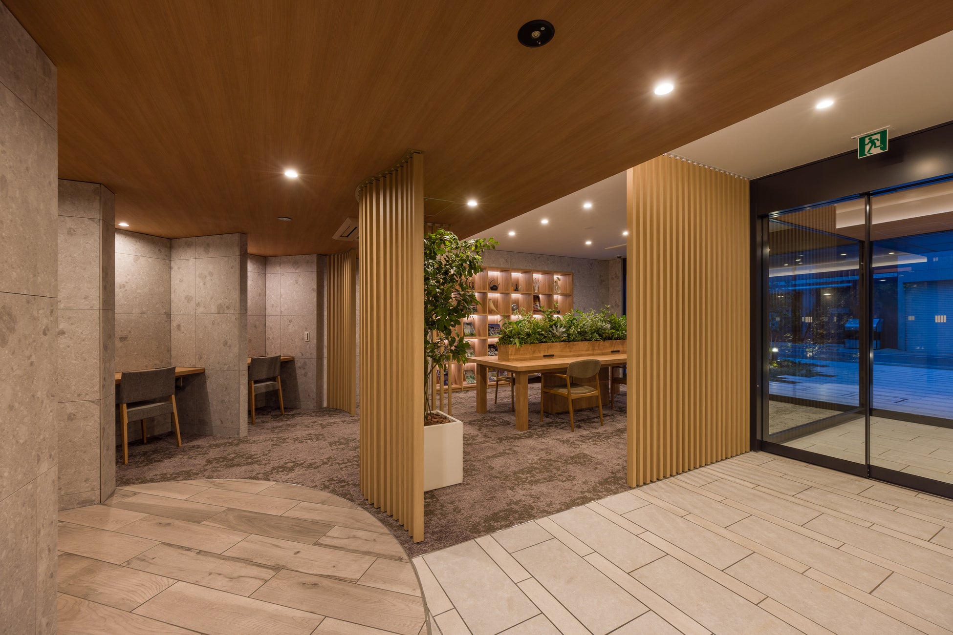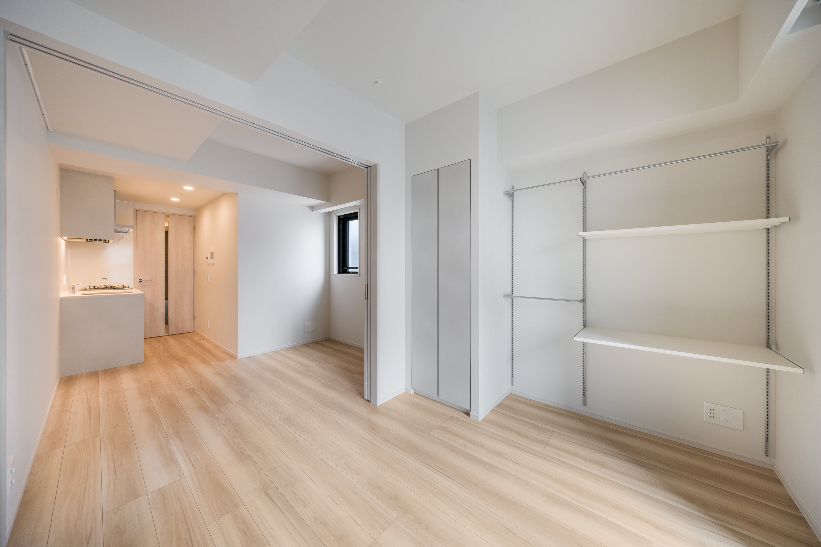 1階には外部からの視認性のあるエントランスラウンジを設け、木調デザインを取り入れることで、建物内外からぬくもりを感じられる空間に仕上げました。また無料Wi-Fiと室内空調を完備した入居者様専用のビジネスラウンジを設けています。ビジネスラウンジには、個別ブースを2か所、ゆとりあるワークスペースを4席ご用意。仕事や作業、読書など、日常に寄り添うサードプレイスとして、多様なシーンでご利用いただけます。建物内共用部は全フロア、ホテルライクな内廊下仕様です。専有部は、洗面化粧台に上質な家具を思わせる「モビリスタ フロート」※を一部住戸に初採用しました。また、1DK住戸には可動式収納棚「シューノ19」を採用。収納にもデスクにもなるフレキシブルな設えにより、入居者様の好みでカスタマイズ可能な居室を提案します。