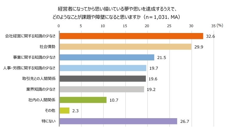 また、夢や思いを達成するうえで課題や障壁になることについて聞いたところ、「会社経営に関する知識の少なさ」(32.6%)が最も多く、次いで「社会情勢」(29.9%)でした。一方で、「特にない」は3割近く(26.7%)でした。
