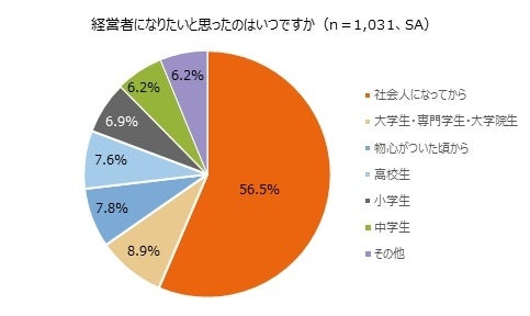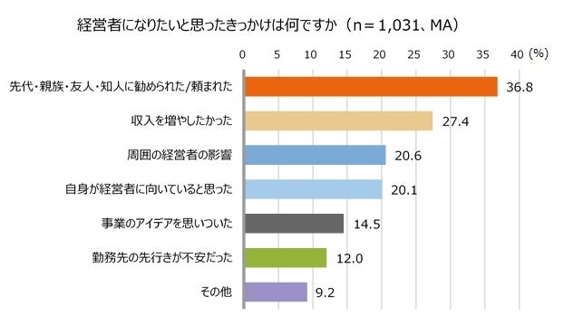 経営者になりたいと思った時期は社会人以降が過半数(56.5%)を占める。きっかけは、「先代・親族・友人・知人に勧められた/頼まれた」が最多で36.8%