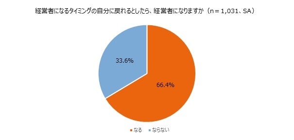 中小企業経営者1,031名に、経営者になるタイミングの自分に戻れるとしたら経営者になるか聞いたところ、66.4%が「なる」と回答し、半数以上がまた経営者になりたいと思っていることが明らかになりました。