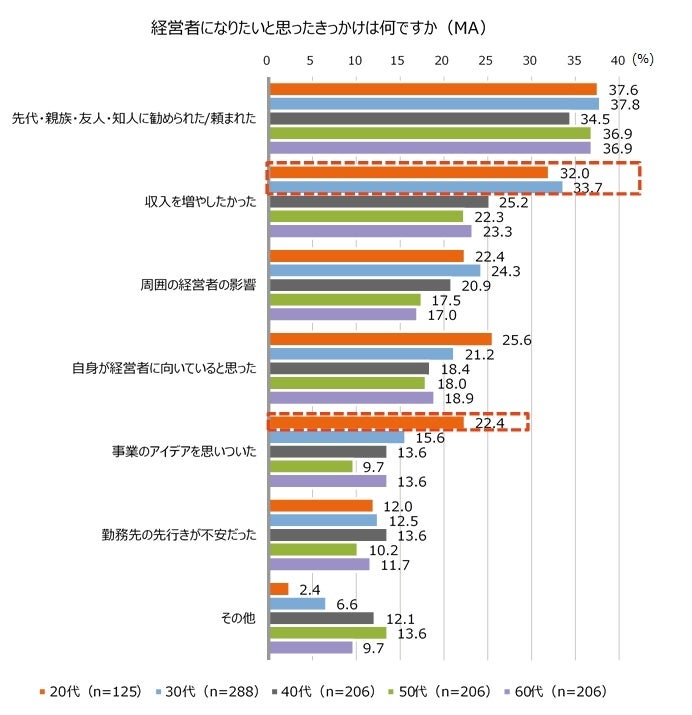 年代別に回答の特徴をみると、20代は「事業のアイデアを思いついた」が他年代と比べて高く22.4%、「収入を増やしたかった」は、20代と30代の若年層が他の年代と比べて5ポイント以上高い結果となりました。