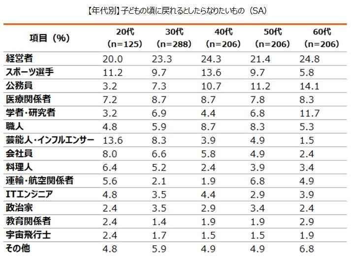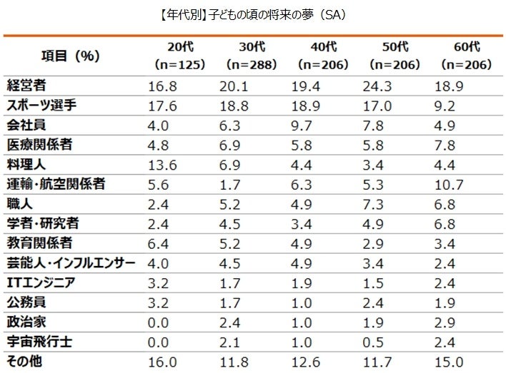 子どもの頃の夢で最も多かったのは「経営者」(20.2%)。年代別では50代が最多(24.3%)
