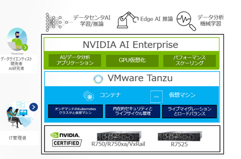 「NVIDIA AI Enterprise」は、NVIDIA認定システムに搭載したVMware vSphereでのみ実行されるAIおよびデータ分析ソフトウェアです。Dell Technologies Validated Design for AIは、活用することで、従来の管理操作を変えることなく、GPU資源を仮想化して利用効率を向上することができます。この新しい基盤は従来型のワークロードだけでなくコンテナ化されたクラウドネイティブワークロードにも対応し、企業のデジタル化を加速することができます。