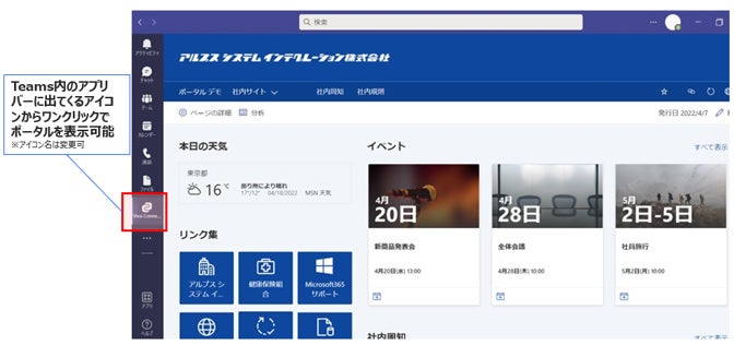 <Teamsアプリ内にポータルサイトを表示したイメージ>