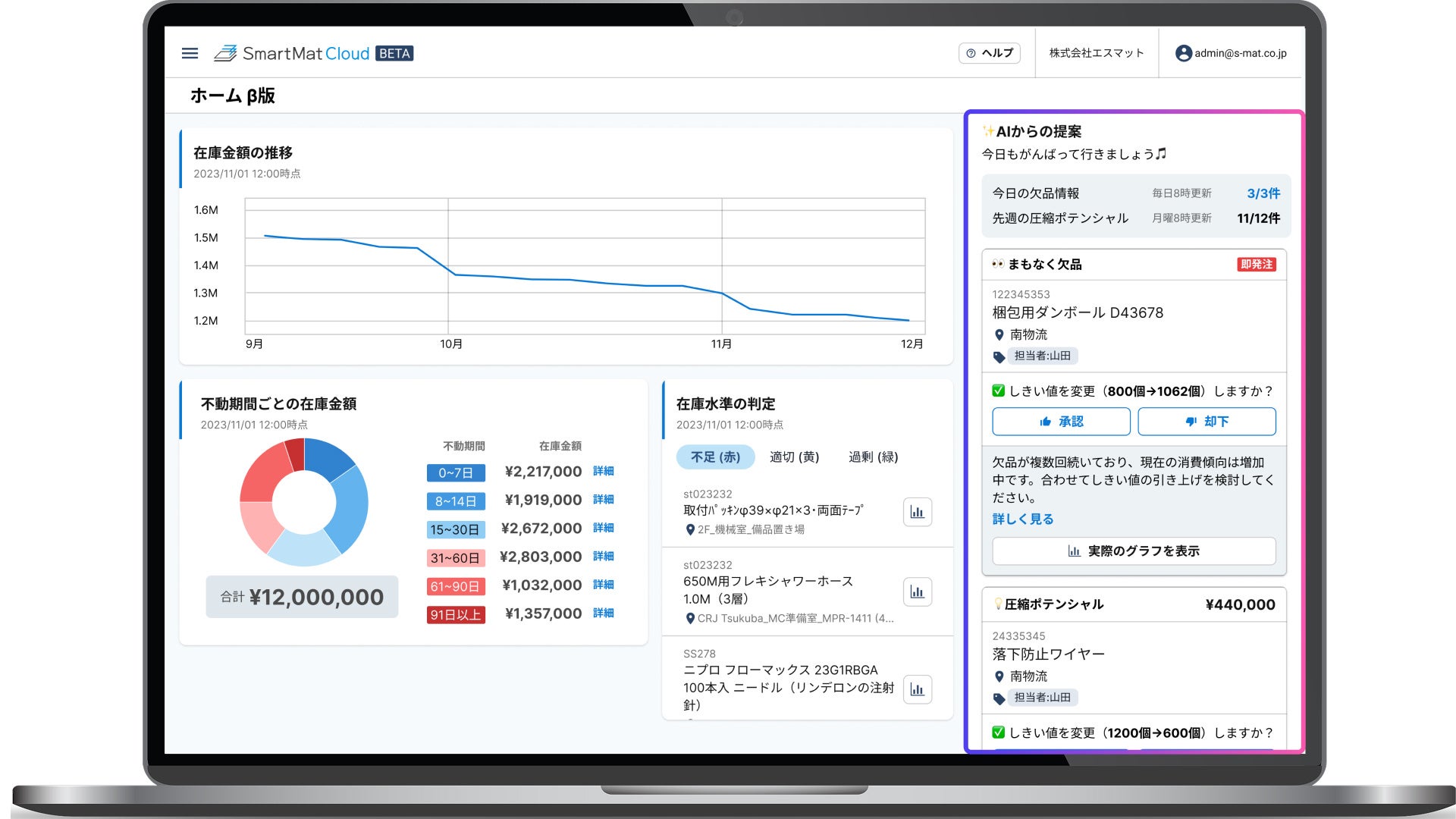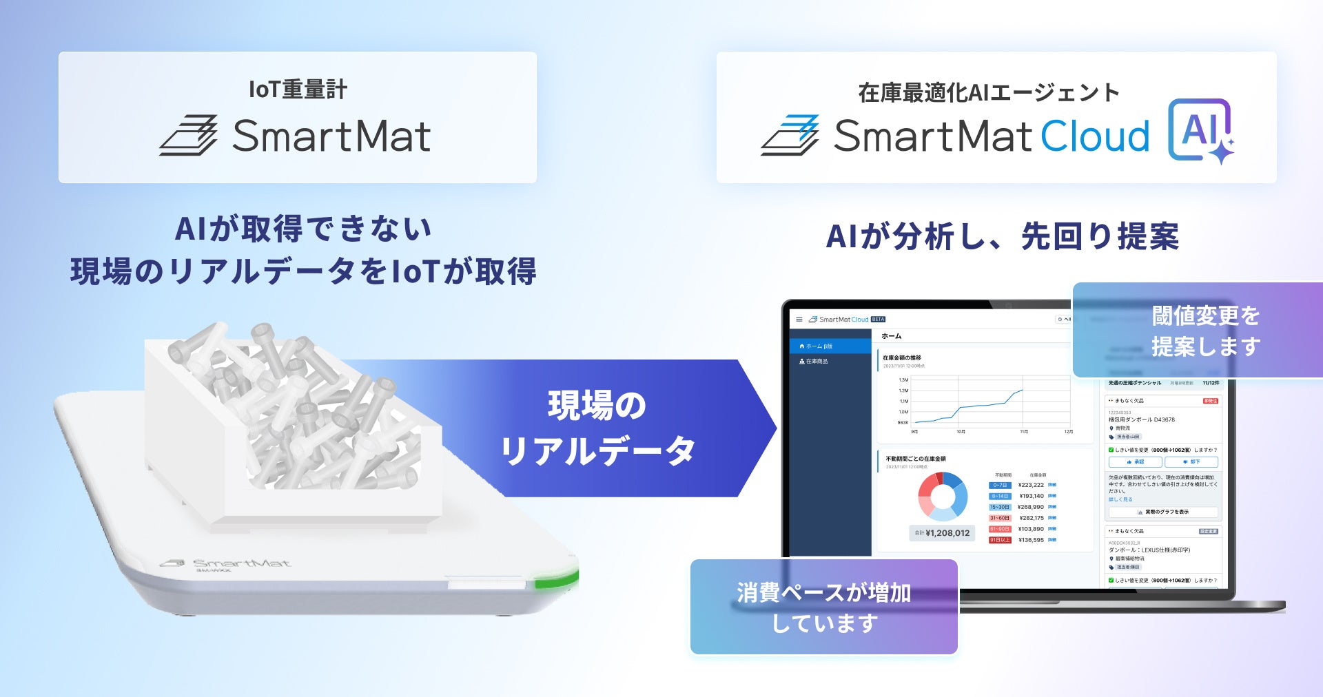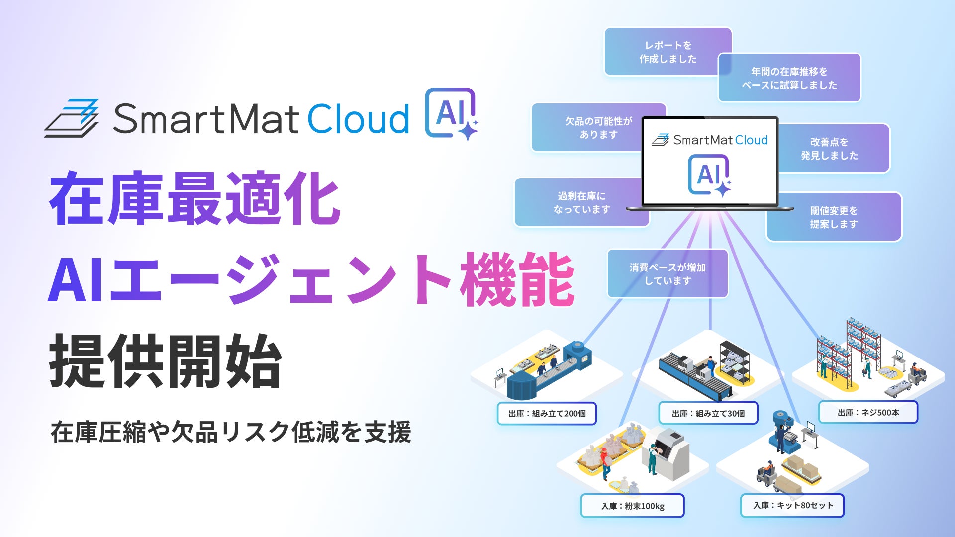 株式会社エスマット(本社:東京都品川区、代表取締役:志賀 隆之/林 英俊)は、IoT重量計を活用した在庫管理サービス「SmartMat Cloud(スマートマットクラウド)」において、新機能「在庫最適化AIエージェント機能」のβ版を2025年6月19日より提供開始しました。本機能は、IoT重量計が計測した在庫の使用傾向や時系列パターンをAIが学習し、欠品リスクや在庫圧縮の可能性を自動で検出。タイムリーな“先回り提案”を現場に提供し続けることで、在庫の最適化を支援します。製造業における人手不足や属人化、在庫ロスの課題に対し、データとAIを活用して「勘と経験」に頼らない現場判断の革新を提案します。