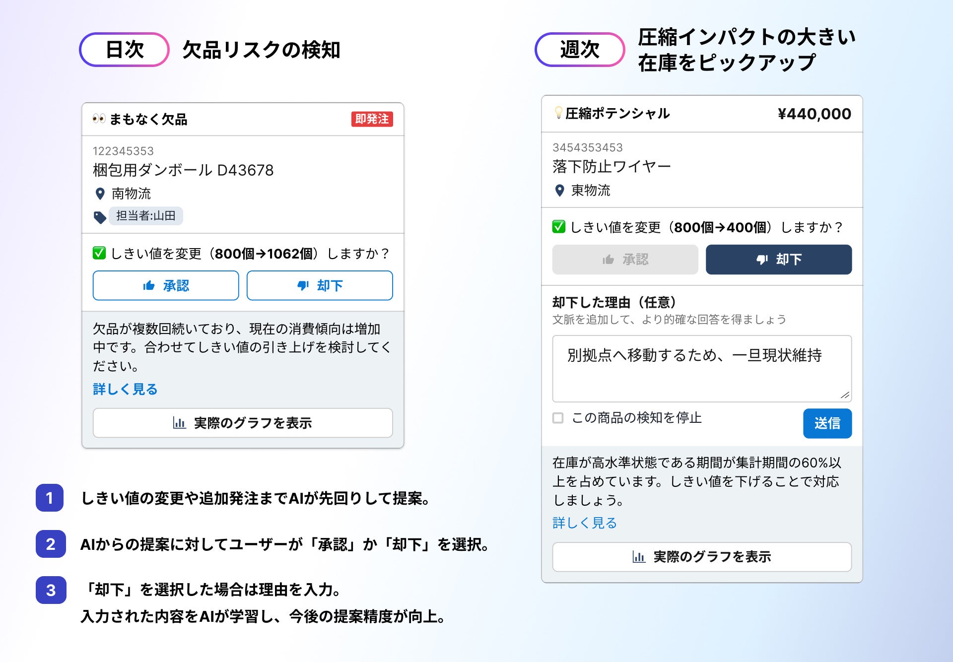 ■ 機能概要:AIが在庫の変化・問題の「抽出」を行い、現場で「判断」が生まれる