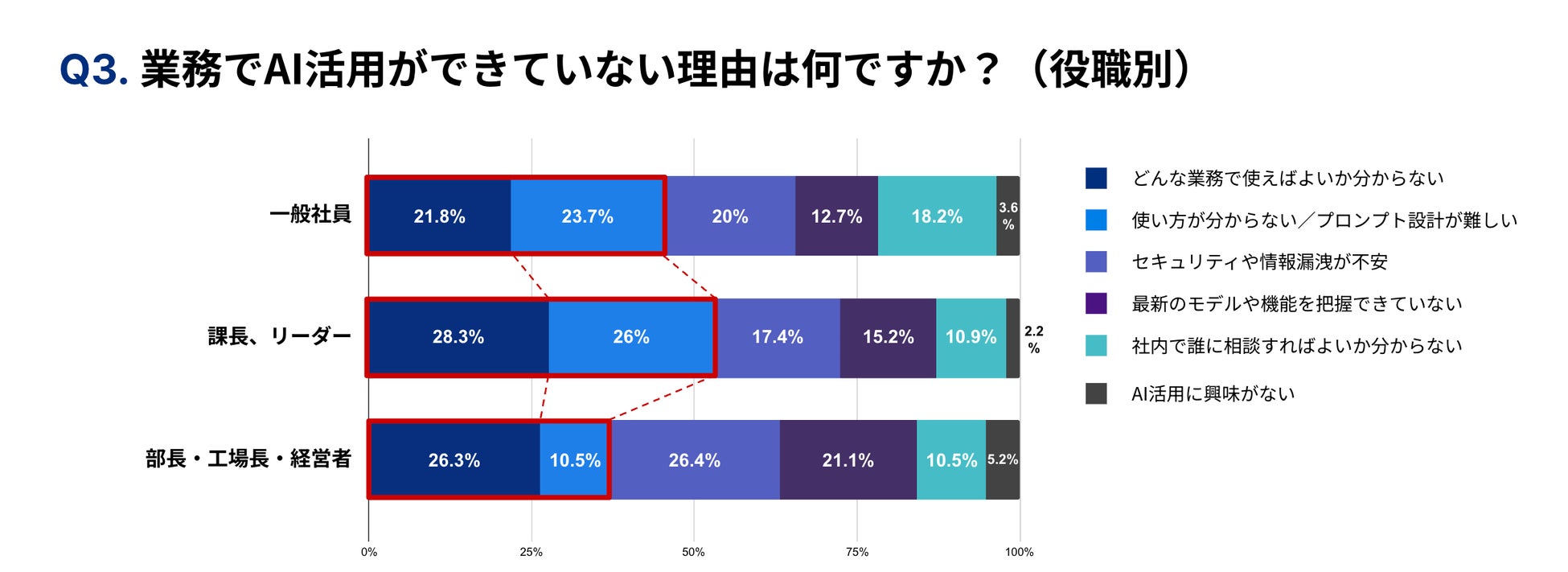 さらに、製造業では経営層と現場層でAI活用への課題認識が異なり、現場層からは「どんな業務に使えばよいか分からない」「使い方が分からない」「プロンプト設計が難しい」といった、実運用時のハードルが数多く指摘されました。