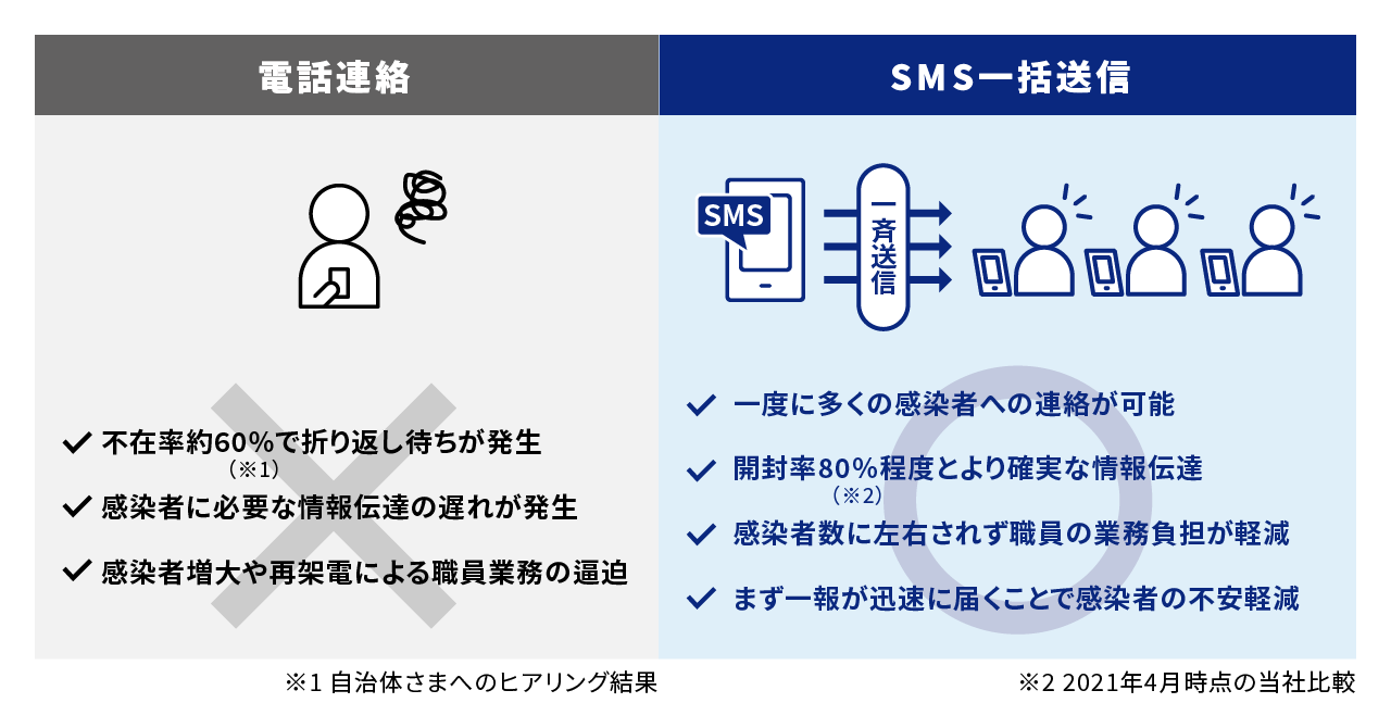 自治体や医療機関においては新型コロナウイルス感染者への連絡の際、電話を主な連絡手段として利用されていますが、①電話連絡時の高い不在率を受けて折り返し待ちが発生、②電話応対の遅れによって必要な情報伝達の遅れが発生、③感染者数の増大や再架電によって職員業務が逼迫、といった課題が生じています。