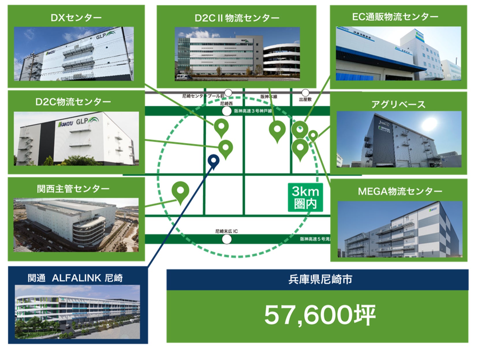 物流とITオートメーション事業を展開する株式会社関通(本社:兵庫県尼崎市、代表取締役社長:達城久裕、以下「関通」)は、この度、アレス・マネジメント・コーポレーション(ニューヨーク証券取引所:ARES)傘下で物流不動産業界のリーディングカンパニーである日本GLP株式会社(本社:東京都中央区、代表取締役社長:帖佐 義之[1]、以下「日本GLP」)が開発する大規模多機能型物流施設「GLP ALFALINK 尼崎South」(兵庫県尼崎市道意町7-1-10)の一部区画を賃借し、当社の新たな戦略的物流拠点「関通ALFALINK尼崎センター」を設立・運用を開始することをお知らせいたします。