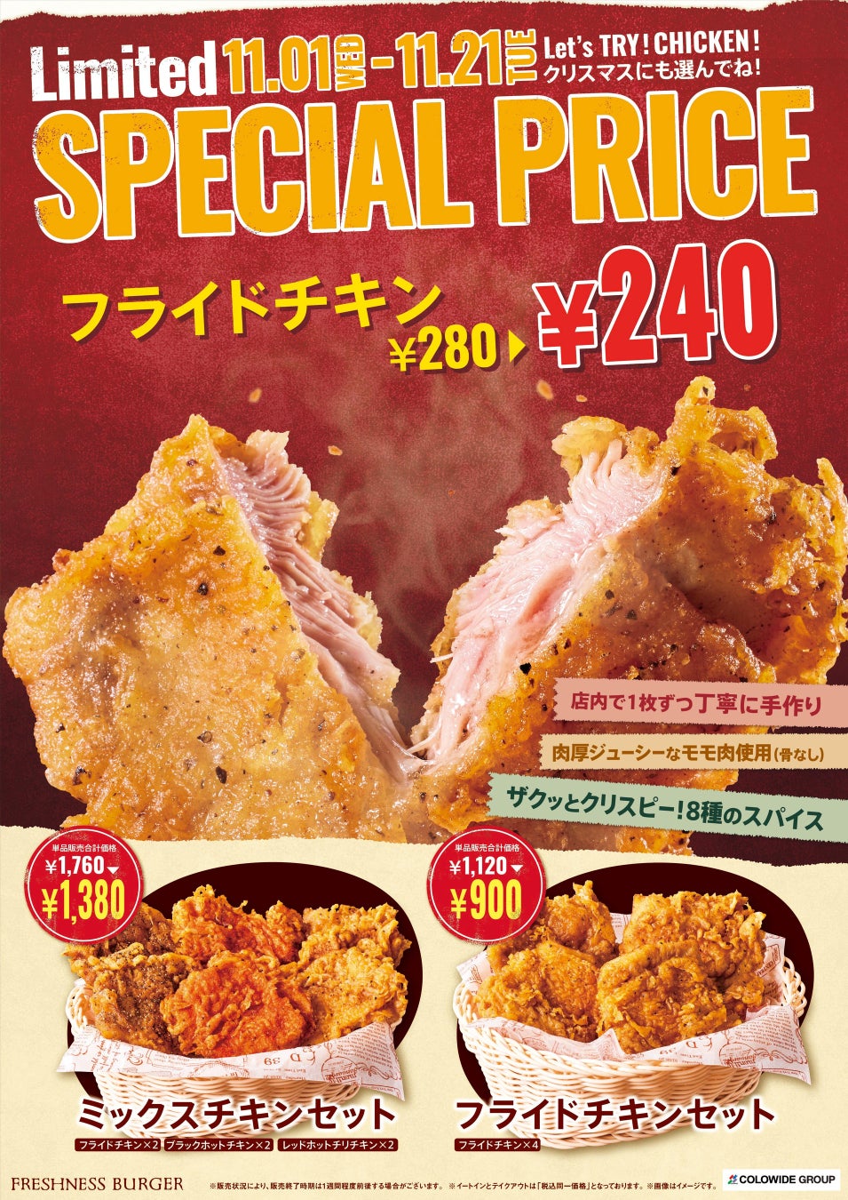 「今年もいつもと同じ」でいいの?今だけ!フライドチキンが最大約20%OFF!クリスマス前に、ご試食いかが!?「SPECIAL PRICEフレッシュネスチキン」