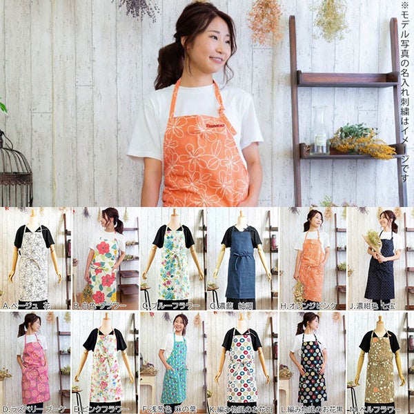 豊富な色柄、国内縫製のエプロンに、京都の熟練刺繍職人による名入れ刺繍を施します。
