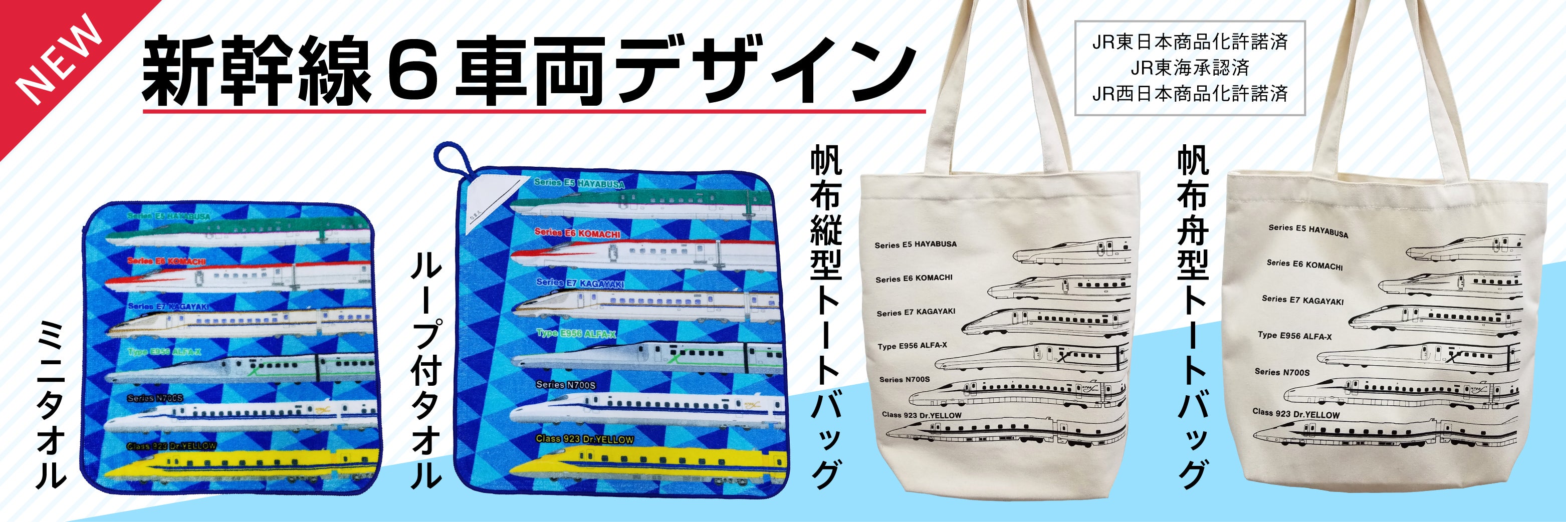 新幹線6車両デザインで新商品(帆布トートバッグ、ミニタオル・ループ付タオル)を販売致します!