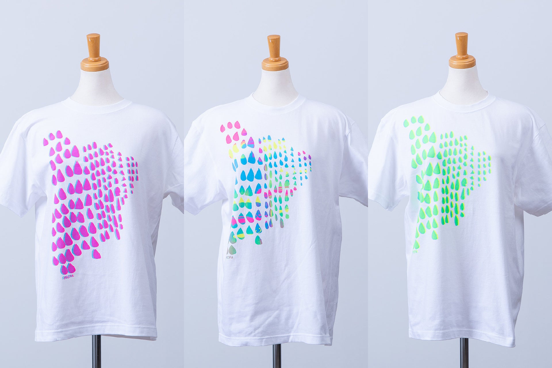 【1周年記念】しずくTシャツ限定モデル(左より、グリッチ、ピンクニジ、パセリ)¥6,600(税込)