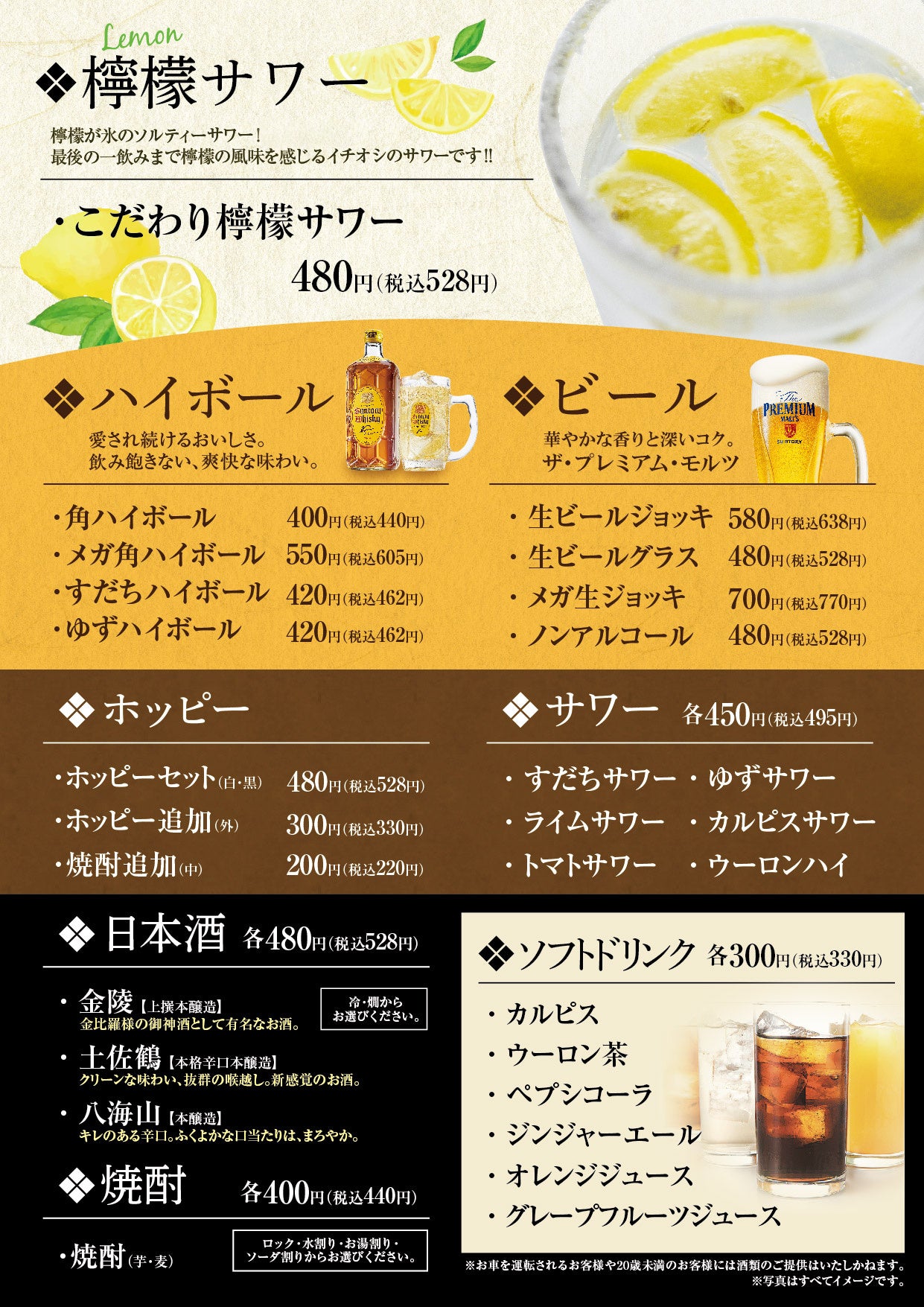 2000年7月7日より西梅田店のオープンと同時に以前までのうどん専門か ら、昼は本格讃岐うどん、夜は焼き鳥や手作り豆腐を中心にした、酒の肴
