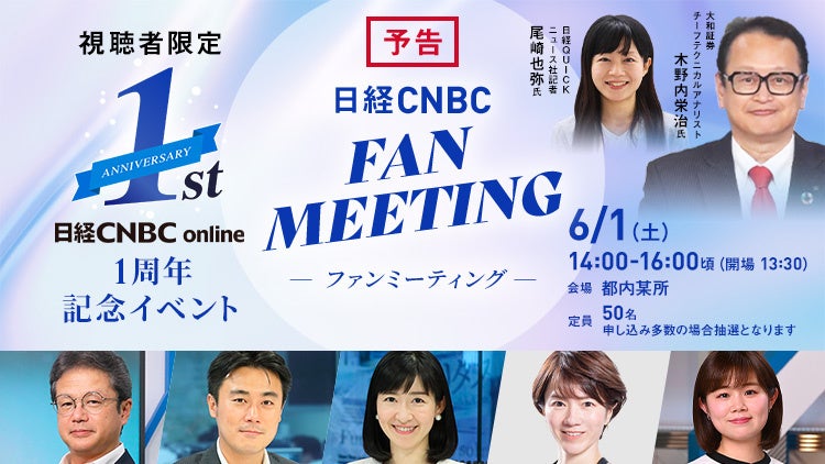 「日経CNBC」をご利用の皆様に向けた特別なイベントの開催を6月1日(土)に予定しております。ゲストは、大和証券 木野内栄治さんと日経QUICKニュース社の尾崎 也弥さん。その他、ファンの皆様におなじみの日経CNBC出演者が登場します。ここでしか聞けないゲストや出演者の話をじかにお楽しみください。詳細は4月15日(月)に、日経CNBCの公式HPでお知らせします。
