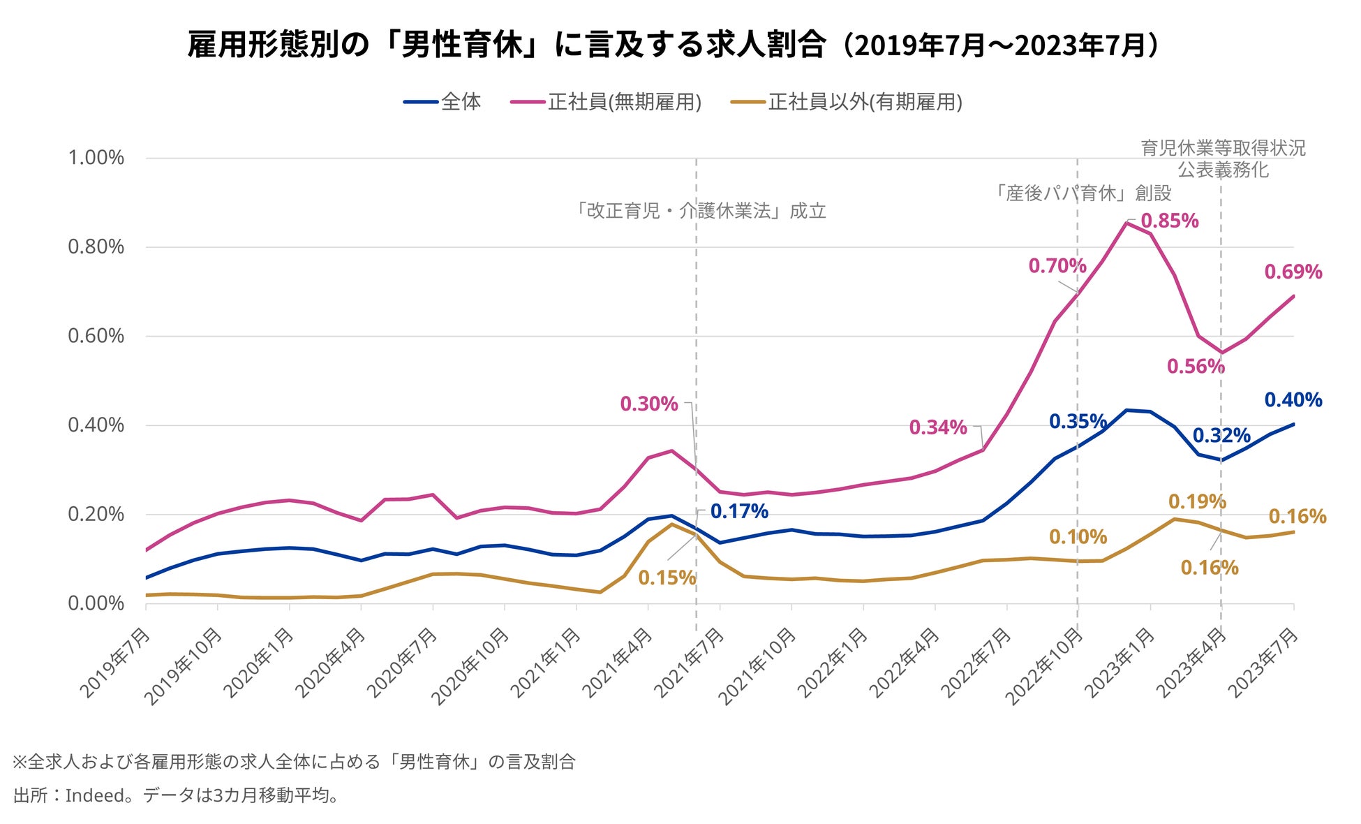 2023年7月時点の「男性育休」に言及している求人割合(3カ月移動平均)について、次の3つの時期を基点として調査しました。