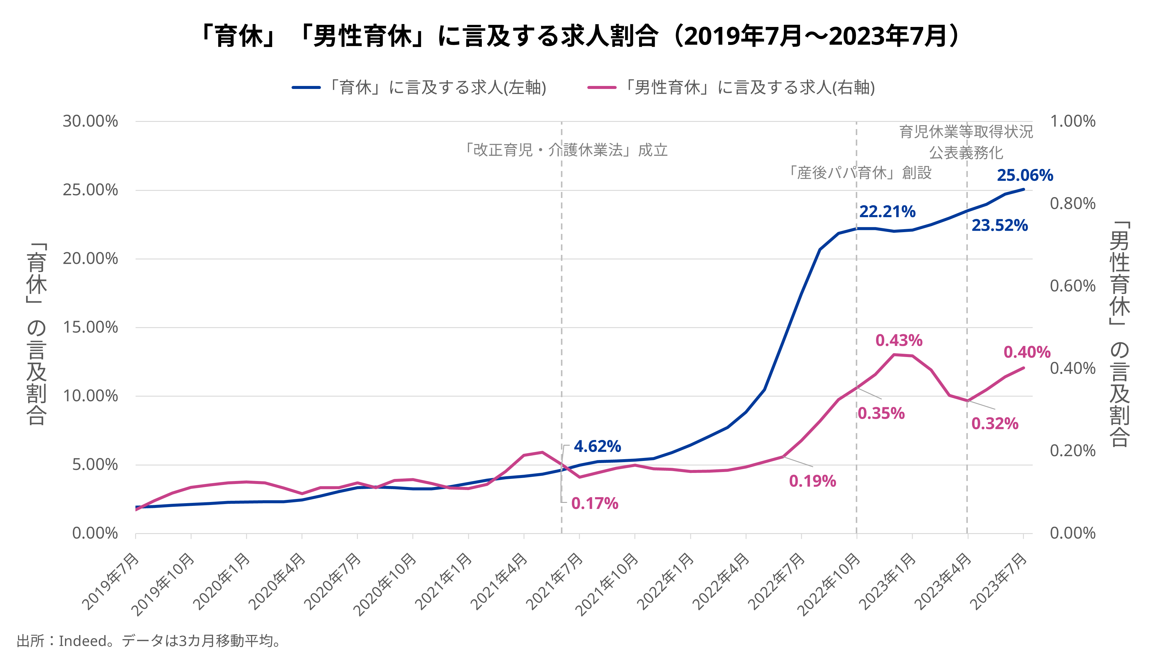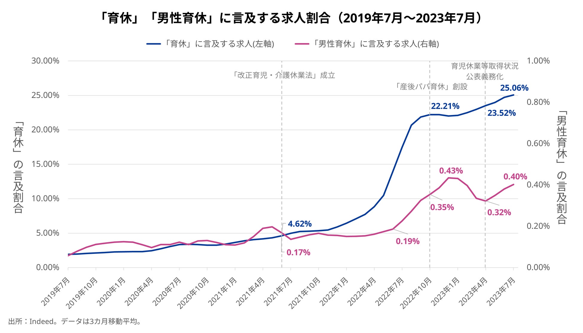 対象期間において、日本のIndeed上に掲載されている求人における「育休」または「男性育休」について言及する求人割合を算出。(3カ月移動平均)