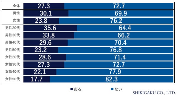 まず20代~50代の会社員の方(※従業員数10人以上の企業に勤めている)に、“リスキリング”の経験について、リスキリングとは『働く環境に合わせて必要とされるスキルを習得すること、“学びなおし”とも言われています』という説明を加えた上で、その有無について聞いたところ、リスキリングの経験が「ある」と回答したのは27.3%、「ない」は72.7%でした。