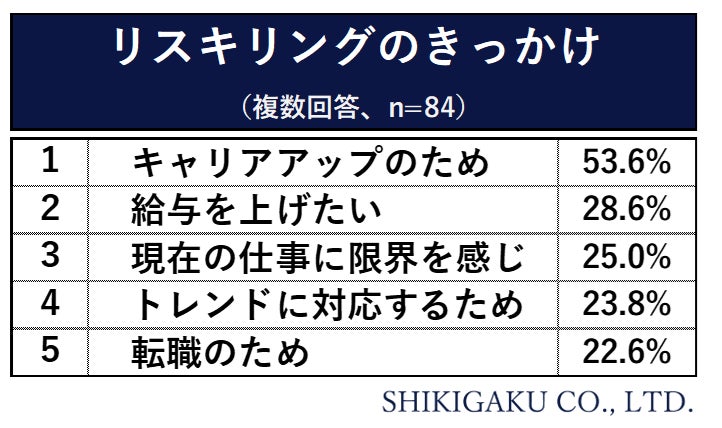 またそのきっかけについては、「キャリアアップのため」が53.6%と最も多く、前問の習得したスキルから鑑みても“プレイヤー”から“マネージャー”になることをきっかけとしてリスキリングをしたという方が多いようでした。