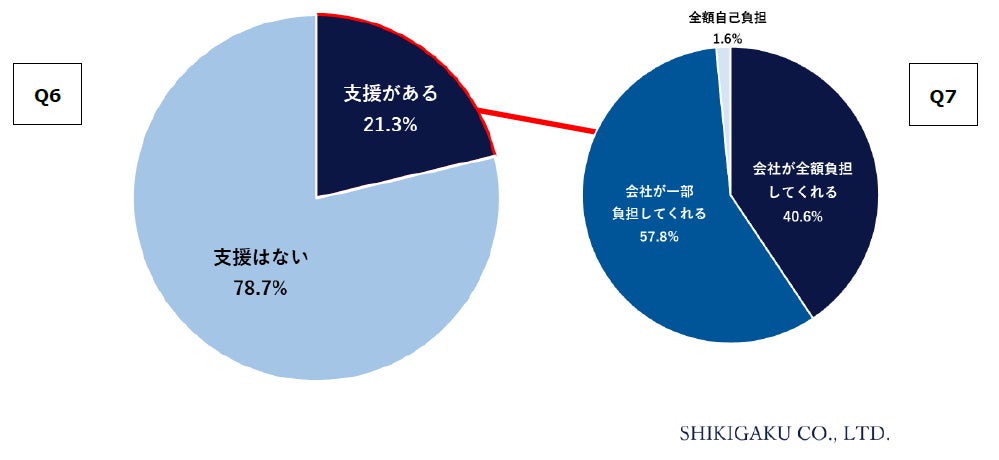 続いて、最近では政府によるリスキリング施策が始まったこともあり、企業側の支援は進んでいるのでしょうか。その内訳を見てみると、リスキリングの「支援がある」と回答したのは21.3%でした。また「支援がある」と回答した方にその費用負担について聞いてみると、「会社が一部負担してくれる」が57.8%、「会社が全額負担してくれる」が40.6%と、ほとんどの企業がリスキリング費用の負担はしてくれるようでした。