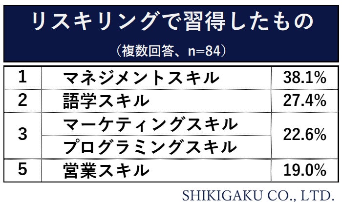 次に前問でリスキリングの経験が「ある」と回答した方に、その習得したスキルについて聞いたところ、最も多かったのは「マネジメントスキル」の38.1%で、「語学スキル」が27.4%、「マーケティングスキル」「プログラミングスキル」が22.6%と続きました。
