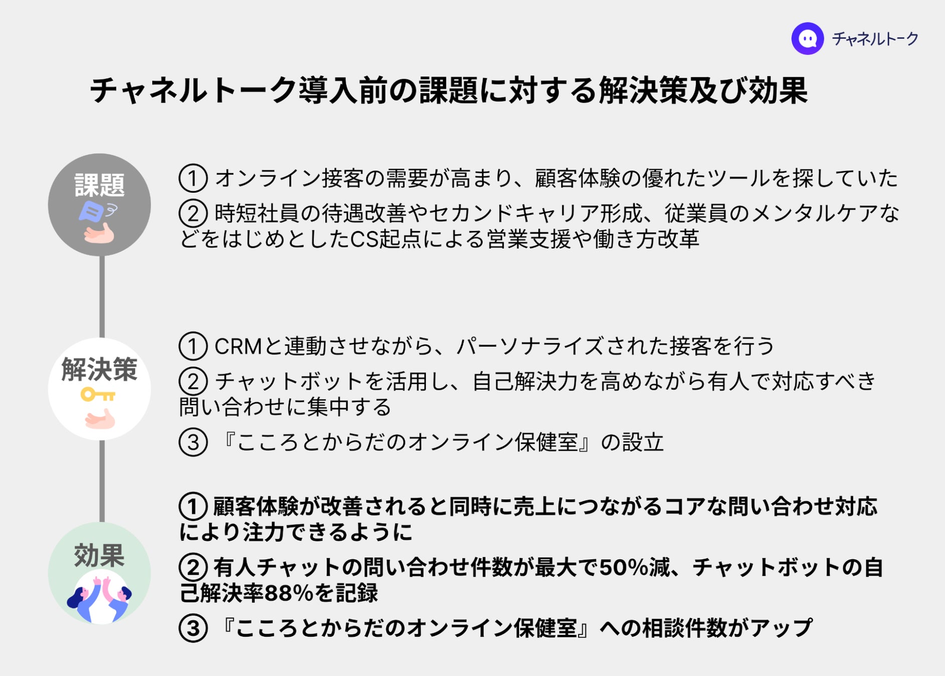 チャネルトークを活用することで、有人チャットの問い合わせ件数が最大で約50%減少。さらにチャットボットの自己解決率は88%を記録しており、人的リソースの削減を実現いたしました。また以前のツールでは仕様上、顧客の途中離脱が目立っていたものの、チャネルトークではセッションが切れることはなく、業務改善と共にお客さまの満足度向上に繋がりました。