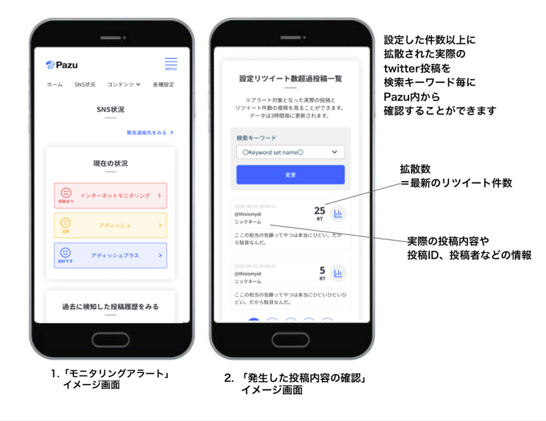 アディッシュでは、そのような事業者の不安を払拭できるよう、誹謗中傷などの投稿を自社内で早期検知できる炎上モニタリングサービス& eラーニングSaaS「Pazu」を、期間限定(※2)で無償提供します。ウクライナ情勢の影響を受け、誹謗中傷や低評価などを受ける可能性があると想定される中小事業者やNPO、NGOに対し提供していきます。
