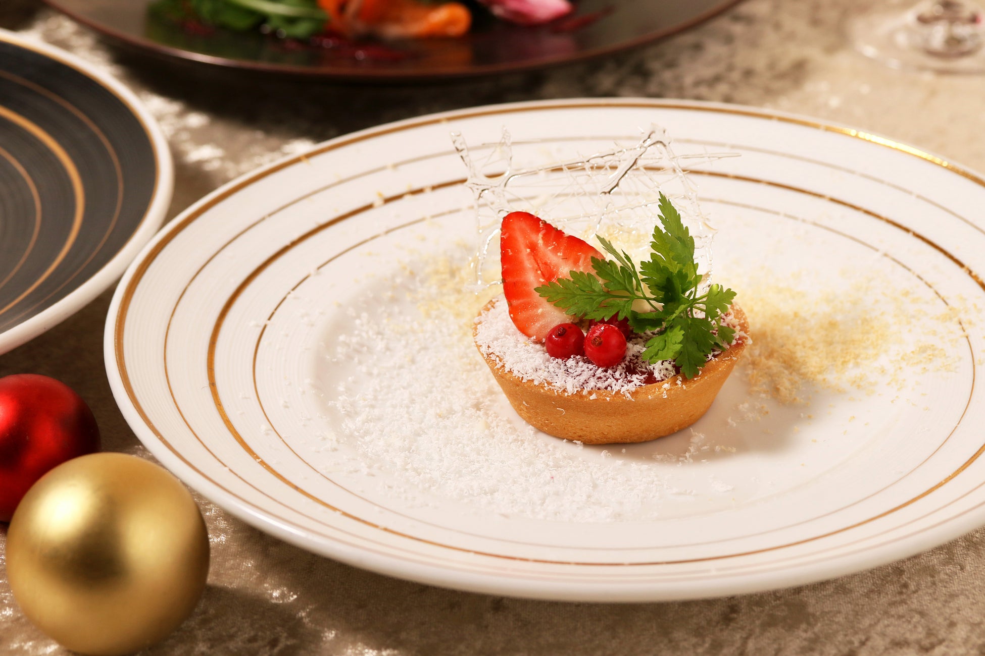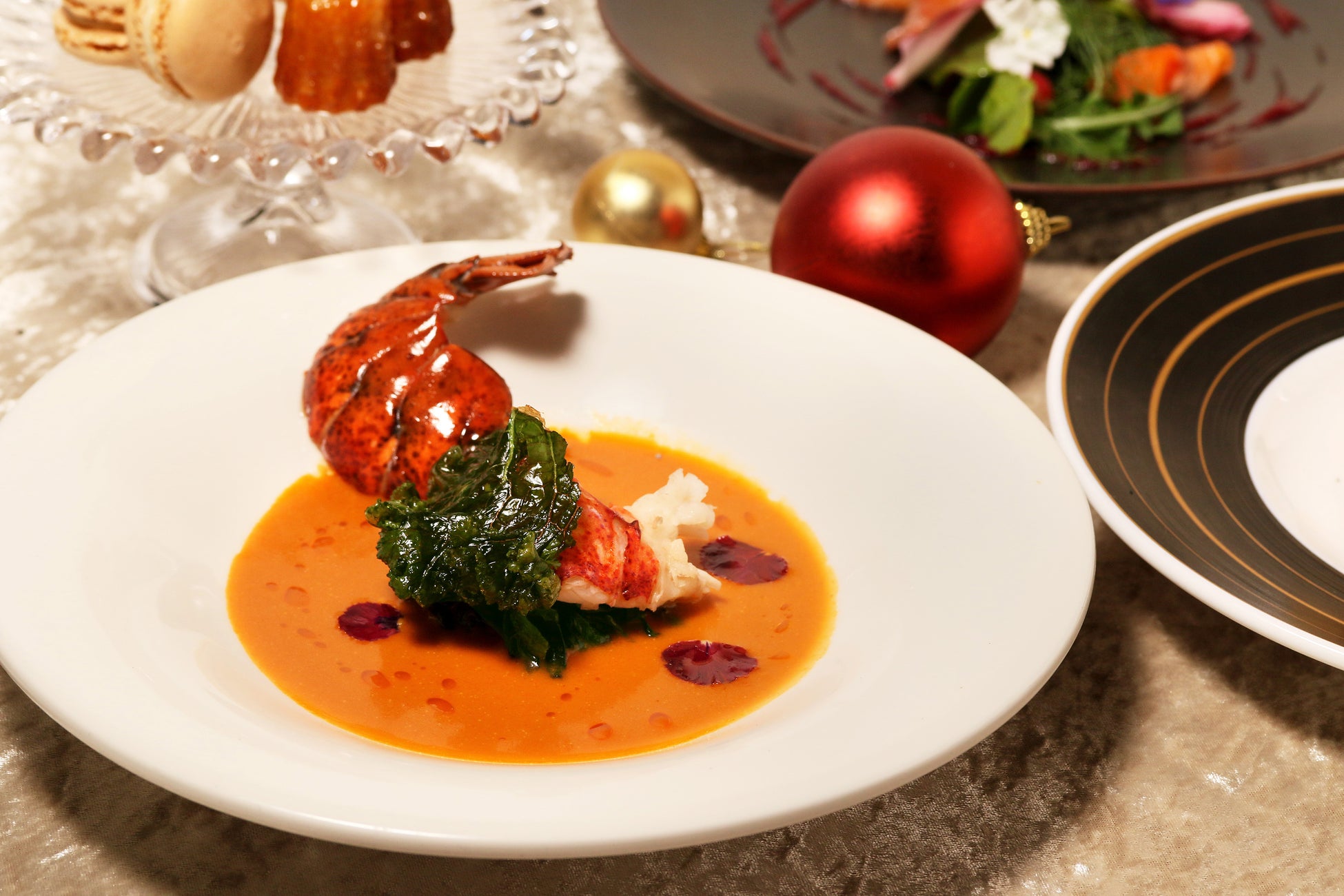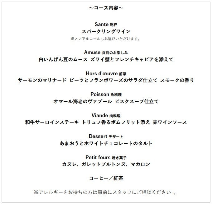 アミューズは、たっぷりのズワイ蟹とフレンチキャビアをあしらった白いんげん豆のムース。白・赤・緑のクリスマスカラーが美しく映える一皿です。続くオードブルには、ビーツとフランボワーズを合わせた鮮やかなサーモンのマリネをご用意しました。魚料理は、フランスの食卓でもクリスマスの定番高級食材・オマール海老を使用。芳醇なビスクスープ仕立てに縮みホウレンソウを添え、彩り豊かに濃厚な旨みと香りを存分にご堪能いただけます。肉料理には、和牛サーロインのステーキを。トリュフ香るポムフリットを添え、風味豊かに仕上げました。デザートは、あまおうとホワイトチョコレートのタルトで、クリスマスと白銀の雪の世界をお皿の上に表現。食後には3種のプティフールがゆったりとした余韻を引き立て、くつろぎのひとときを彩ります。