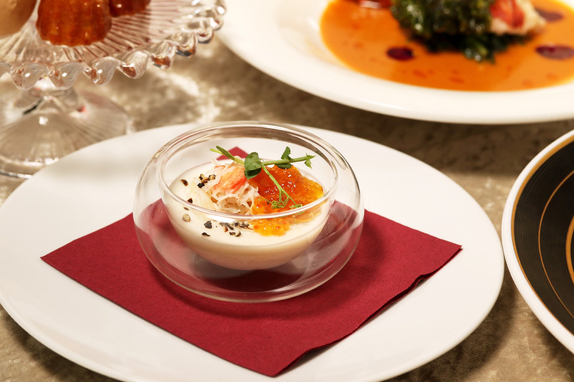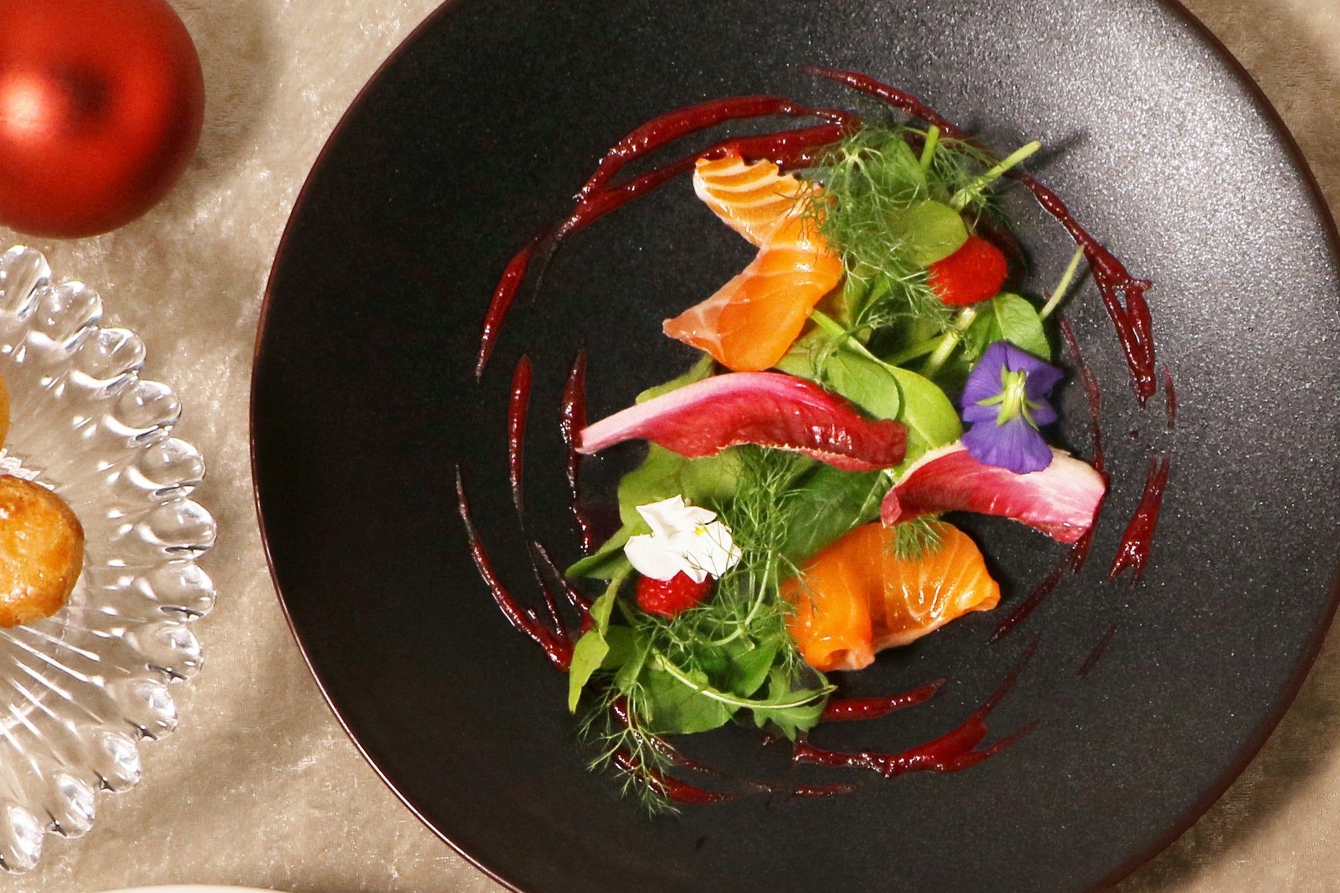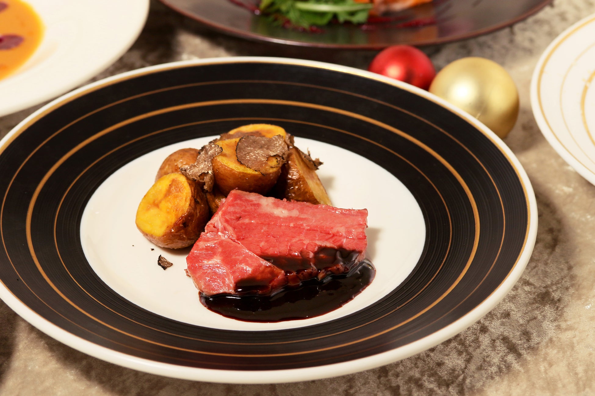 アミューズは、たっぷりのズワイ蟹とフレンチキャビアをあしらった白いんげん豆のムース。白・赤・緑のクリスマスカラーが美しく映える一皿です。続くオードブルには、ビーツとフランボワーズを合わせた鮮やかなサーモンのマリネをご用意しました。魚料理は、フランスの食卓でもクリスマスの定番高級食材・オマール海老を使用。芳醇なビスクスープ仕立てに縮みホウレンソウを添え、彩り豊かに濃厚な旨みと香りを存分にご堪能いただけます。肉料理には、和牛サーロインのステーキを。トリュフ香るポムフリットを添え、風味豊かに仕上げました。デザートは、あまおうとホワイトチョコレートのタルトで、クリスマスと白銀の雪の世界をお皿の上に表現。食後には3種のプティフールがゆったりとした余韻を引き立て、くつろぎのひとときを彩ります。