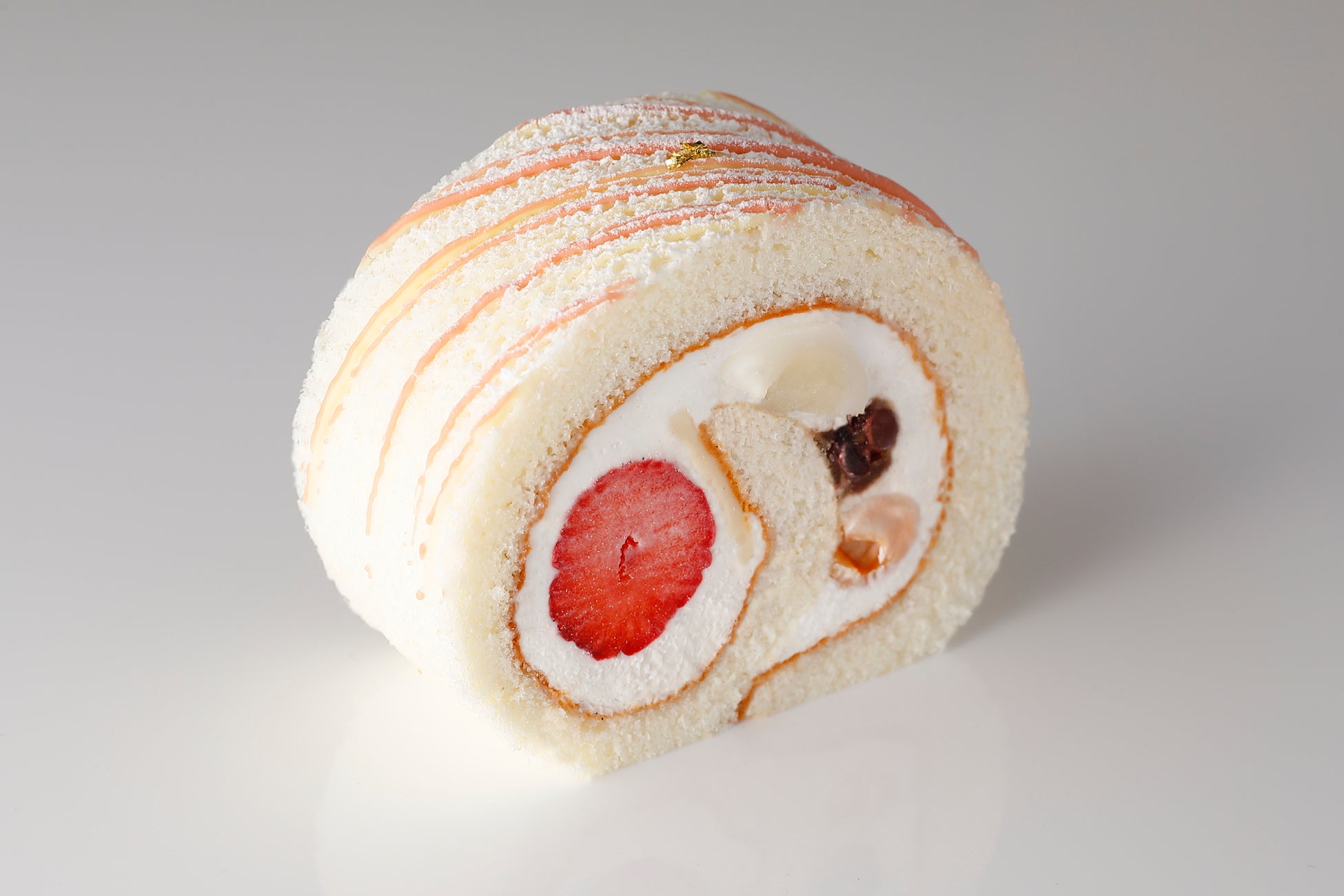 厳選した大粒の「博多あまおう®」と黒蜜あんこ、白玉、ライチを純白の生地でふんわりとロール。