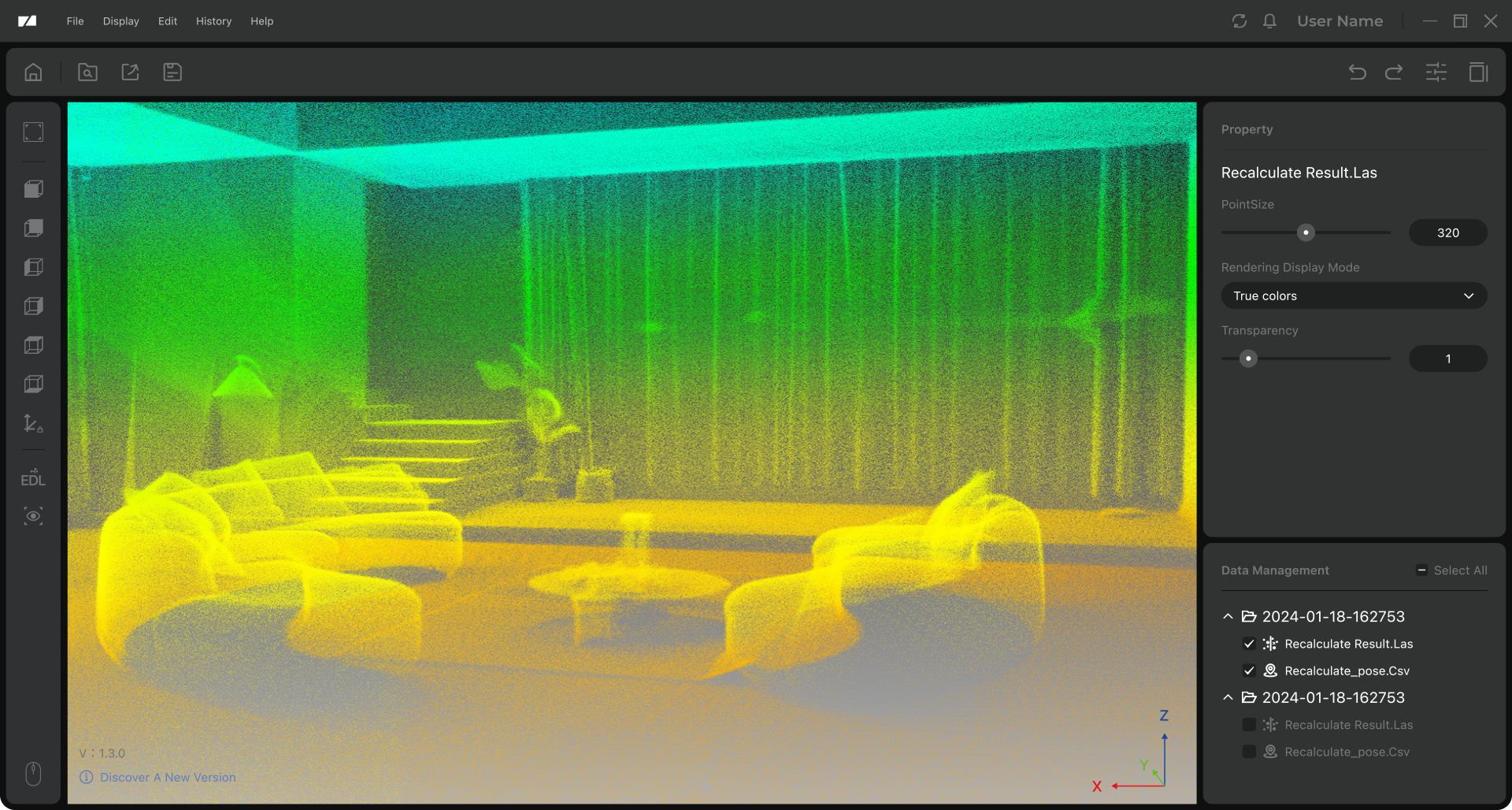 建築測量、映画制作、仮想展示会など幅広い用途に対応し、専用ソフトウェアにより、点群データの取得から最終的なビジュアル化までをスムーズに実行可能。付属の無償ポストプロセスソフトでは、点群データの編集・ノイズ除去で最適化が行え、作業効率を大幅に向上させます。出力形式はPLYやPNG+OBJなどに対応し、非営利目的でのビジュアル共有は無料で利用できます。さらに、点群モデリングや測量に対応したスタンドアロン型モデリングソフトも標準で付属し、無料プランも用意されています。