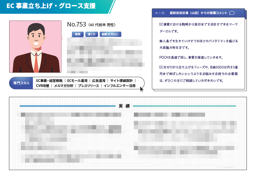 (推薦コメント例:ECのプロフェッショナルです。食(健康食品含む)を最も得意とされており、その理由は、Webでサービスを売るにあたり、最も難易度の高いものは”食”と考え、その道を極められました。支援企業は累計1,000社以上、制作LPは5,000ページ超えは伊達じゃありません。発する言葉すべてに重みがあります。独自ドメインECやモールでお困りの企業様に是非ご紹介したいです。)