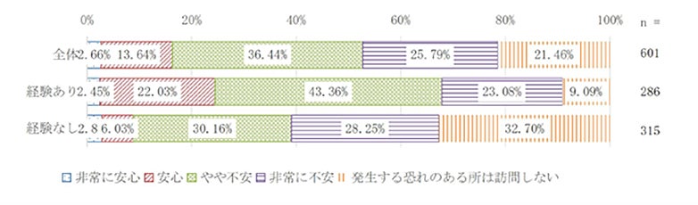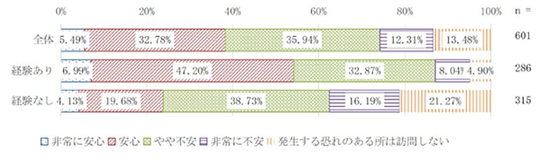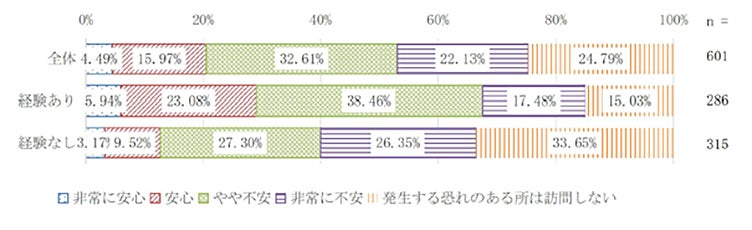地震への不安について、全体(訪日経験有り、無しの合算)として最も多かった回答は「やや不安」で36.4%でした。「非常に不安」と回答した人は25.8%で2番目に多く(「やや不安」「非常に不安」を合わせて62.2%)、「安心」「非常に安心」と回答した人は16.3%でした。訪日経験有りでみると、「やや不安」が43.4%と多くの割合を占めた一方で、「安心」「非常に安心」と回答した人は24.5%と2番目に多い割合となりました。対照的に訪日経験無しの人では、「やや不安」が30.2%、「非常に不安」が28.3%という結果でしたが、最も多い回答は「発生する恐れのある所は訪問しない」で32.7%でした。地震に関しては、「ここが安全」と言われる場所を判別するのは難しいため、「訪日経験無し」だからこその回答と言えるでしょう。