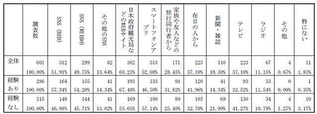災害時の情報収集方法に関して、訪日経験の有無別に関わらず、日本政府観光局などの公式による情報や中国国内のSNS(中国版インスタグラムのRED、中国版XのWEIBOなど)が主な情報収集方法になっています。訪日経験有りの人は情報収集先を「日本政府観光局などのWEBサイト」と回答した人が67.5%で最も多く、一方で訪日経験無しの人が「同WEBサイト」を情報収集先と回答した人は53.7%と13.8%の差がありました。SNSに関しては、訪日経験有りの人は「RED」が57.3%、「WEIBO」が54.2%。一方、訪日経験なしの人は「RED」が46.9%、「WEIBO」が45.7%でした。訪日経験の有無に関わらず、テレビ(訪日有り:32.5%、訪日無し:41.3%)やラジオ(訪日有り:11.5%、訪日無し:10.8%)よりインターネットサービスを利用した情報収集をより重視しています。