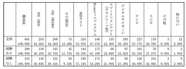 希望の情報を受け取る手段として、多くの支持が集まったのは訪日経験有無問わず、「Wechatミニプログラム」と「WEBサイト」で、それらを通じて「訪日観光客向けの災害情報」を受け取りたい、という回答が半数以上を占めました。「Wechat」は全体が57.6%(訪日経験有り:61.2%、訪日経験無し:54.3%)。「WEBサイト」が全体として53.9%(訪日有り:50.4%、訪日無し:57.1%)となっています。中国国内のSNS(RED、WEIBO)も多くの人が「希望の情報を受け取る手段」に選び、「RED」は全体で42.3%(訪日経験有り:48.3%、訪日経験無し:36.8%)、「WEIBO」は全体で44.3%(訪日経験有り:50.7%、訪日経験無し:38.4%)でした。「テレビ」と回答した人は全体で37.8%とやや低い回答率でしたが、訪日経験無しは40.0%(訪日経験有りは35.3%)という結果でした。