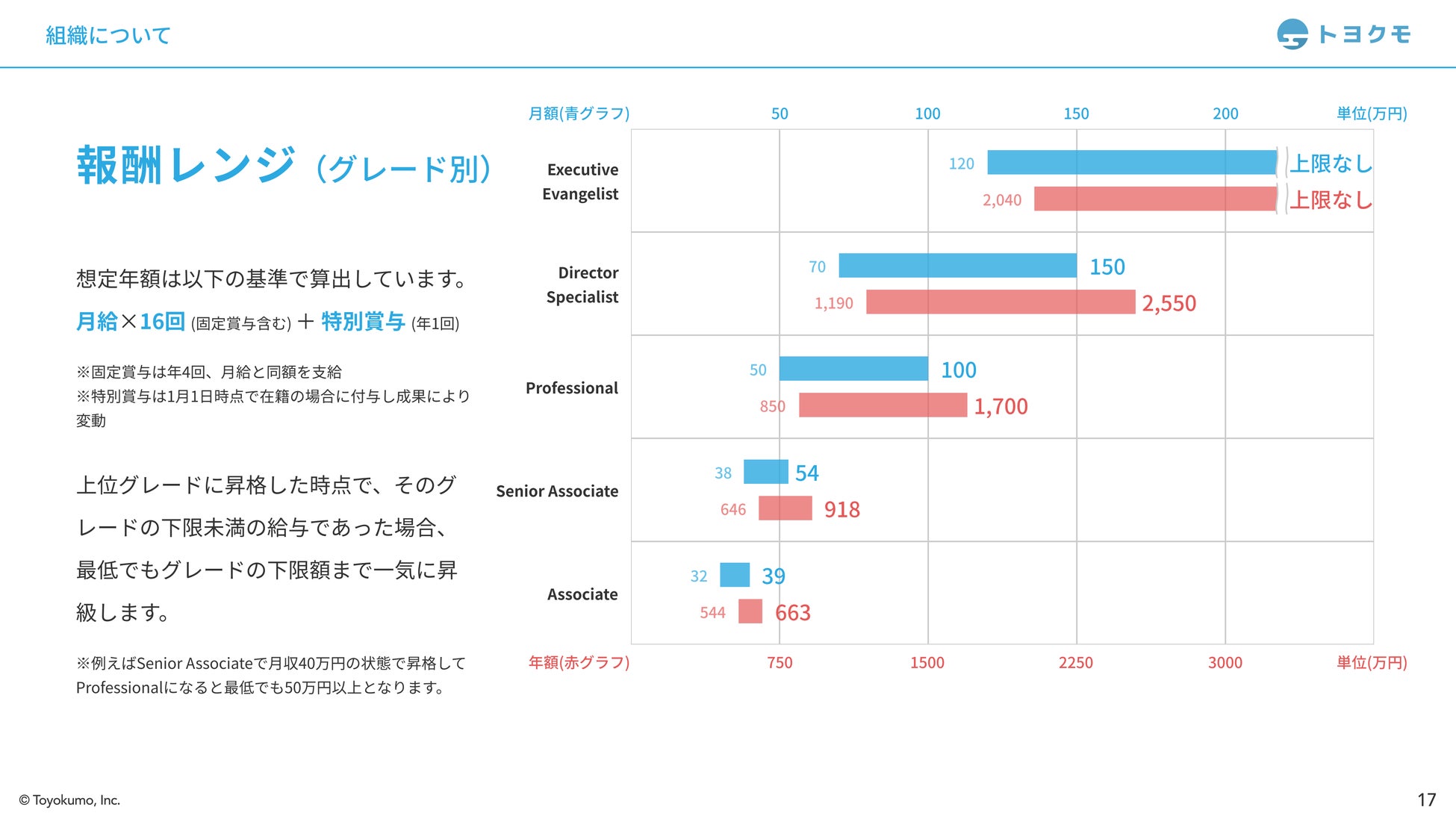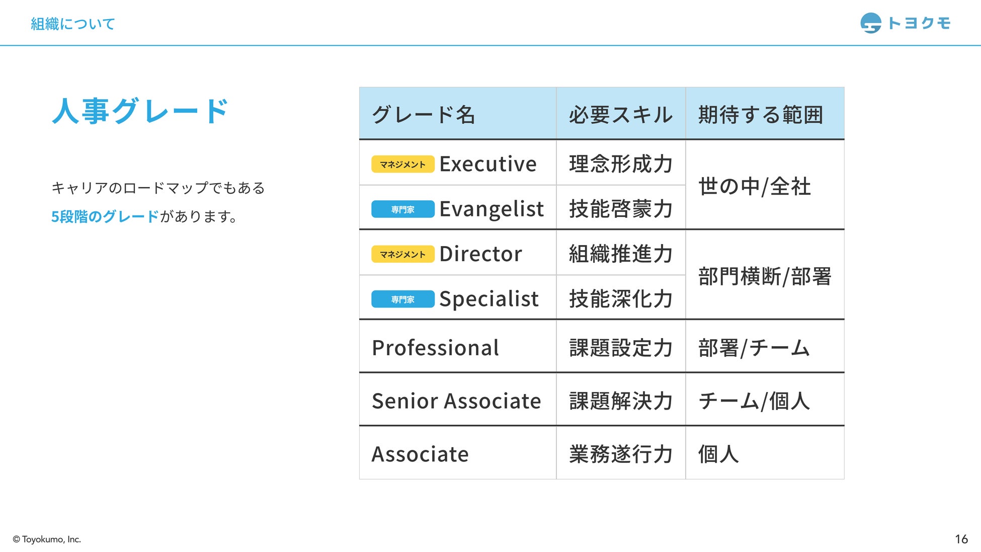 グレードは5段階の『Executive/Director』『Evangelist/Specialist』『Professional』『Senior Associate』『Associate』の5つで構成されています。