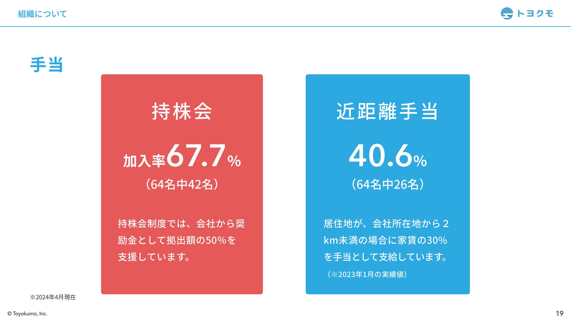 トヨクモは今後も、新規制度の導入や既存制度の改定を積極的に進めていくことで、更なる企業成長や労働環境の整備に努めてまいります。