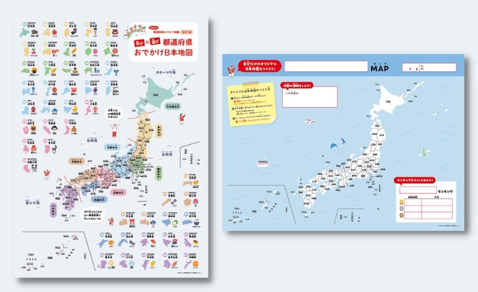 ・付録の大判ポスターは、オモテ面は都道府県の形をシルエットで覚えられるビジュアルポスター、ウラ面は、子どもたちの旅や学びを記録してオリジナルな地図を作ることができる白地図となっています。