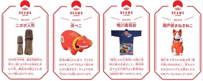 BEAMSが日本の良さや面白さを世界へ発信するプロジェクトとして2016年にスタート。新宿、渋谷、京都のBEAMS JAPAN 3店舗を拠点に、日本の技術が光るプロダクト、伝統に裏付けされた各地の名品、モダンカルチャーやアートに加え、こだわりの日本ブランドやオリジナルウエアなどファッションアイテムも集積し、日本のモノやコトの魅力を国内外に発信しています。これまでに兵庫県神戸市、大分県別府市、福島県などの地方自治体や、異業種の企業ともコラボレーションを行い、店頭イベントに加えて商品開発やガイドブックの発行など、数多くのプロジェクトに取り組んでいます。