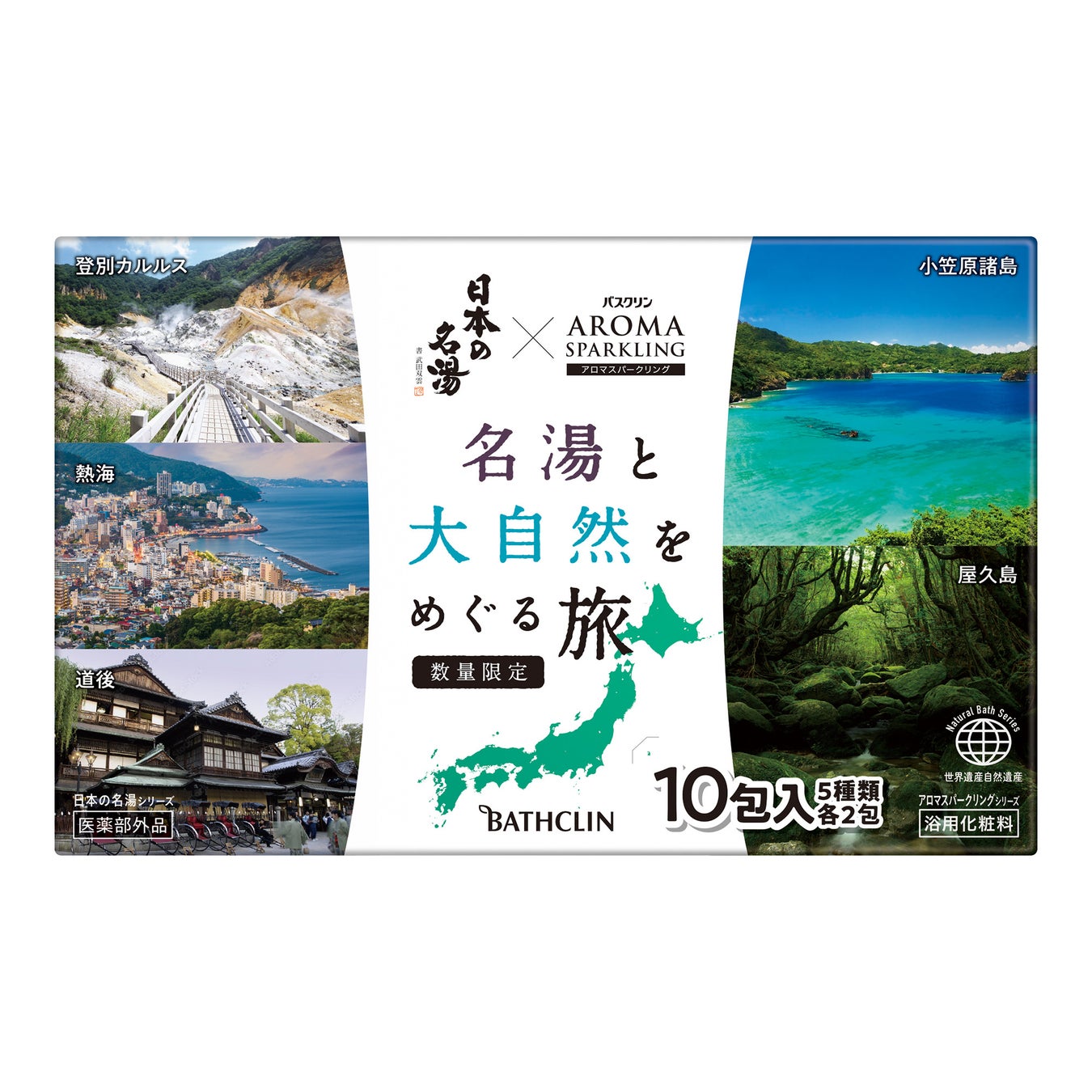 自宅で全国の名所をめぐる旅行気分を楽しんでいただきたいという思いから、温泉タイプの入浴剤「日本の名湯」と世界自然遺産に行った気分が味わえる「バスクリン アロマスパークリング ナチュラルバス」シリーズがコラボレーションしたアソートセット「名湯と大自然をめぐる旅」を数量限定で発売いたします。