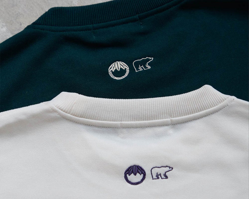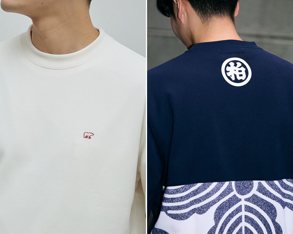 スウェットのフロントはシンプルなクマ刺繍のワインポイント。 バックは” 柏” のマークと、三つ柏の紋様で切り替えた大胆なデザインに。こちらは従業員のみなさんがお召しになっている法被のデザインを採用させていただきました。