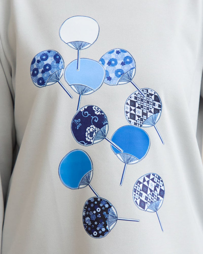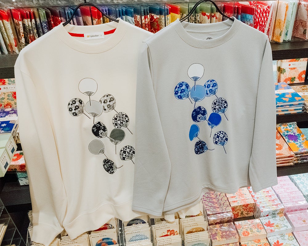 スウェットには、榛原さんが取り扱う伝統的な柄をあしらったうちわを流れるように散りばめました。色数を抑えつつ、それぞれの柄が際立つよう何度もやり取りさせていただき完成したこだわりのプリントデザインです。