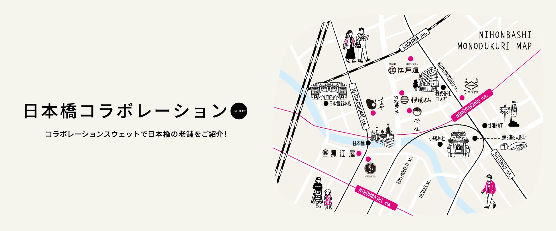 東海道五十三次のはじまりとして知られ、今も日本の道路網の出発点となっている東京・日本橋。この地を拠点とするゴールデンベアは、日本橋を愛し、街を盛り上げたいという思いから本プロジェクトを立ち上げました。Tシャツに続き、第2弾はスウェットを老舗とコラボレーション。伝統と新しさが共存する日本橋の魅力を発信していきます。