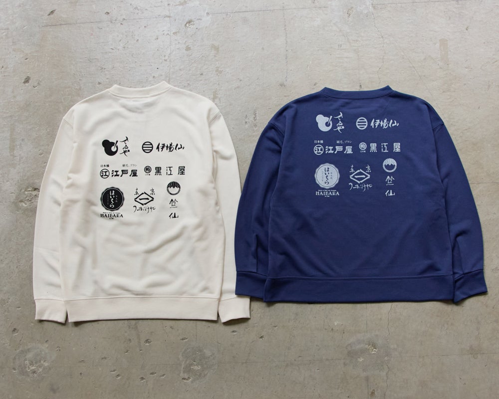 コラボレーションする老舗7店のロゴを背中にプリントした日本橋スウェット。シンプルかつ暖かみのあるアイボリー・ダルブルーの2カラーでご用意しました。