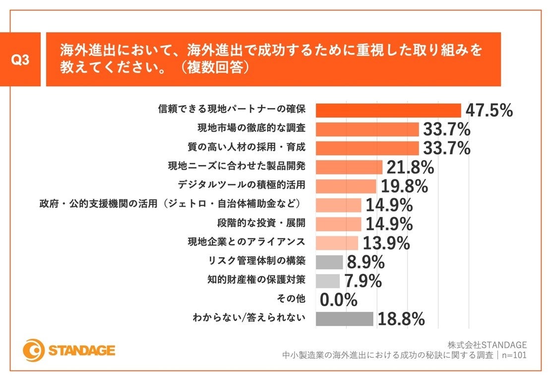 「Q3.海外進出において、海外進出で成功するために重視した取り組みを教えてください。(複数回答)」(n=101)と質問したところ、「信頼できる現地パートナーの確保」が47.5%、「現地市場の徹底的な調査」が33.7%、「質の高い人材の採用・育成」が33.7%という回答となりました。