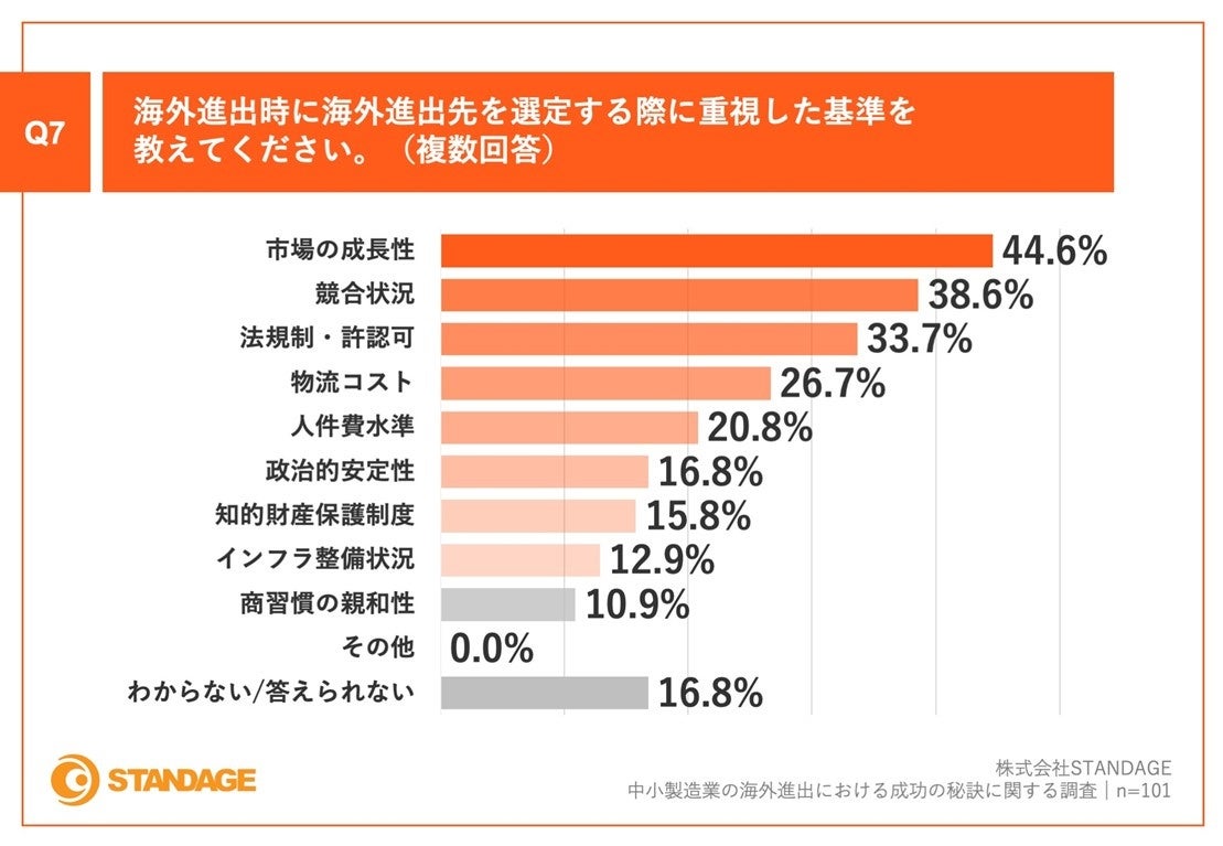 「Q7.海外進出時に海外進出先を選定する際に重視した基準を教えてください。(複数回答)」(n=101)と質問したところ、「市場の成長性」が44.6%、「競合状況」が38.6%、「法規制・許認可」が33.7%という回答となりました。